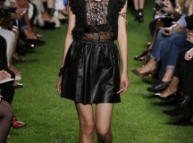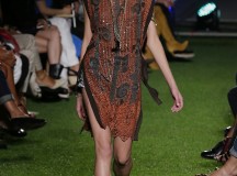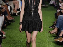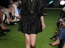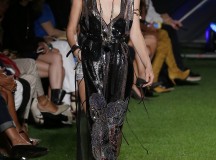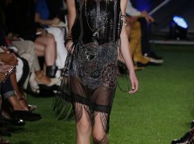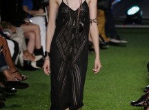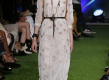 Les vestes en denim brodées et déchirées se mélangent aux Caftans. Le long joue avec le court, la transparence s’oppose aux broderies. Les tuniques satinées sont combinées avec short. Les robes en corolle sont marquées à la taille par des ceintures en cuir. Les robes en dentelle Sangallo noir irradient de lumière.