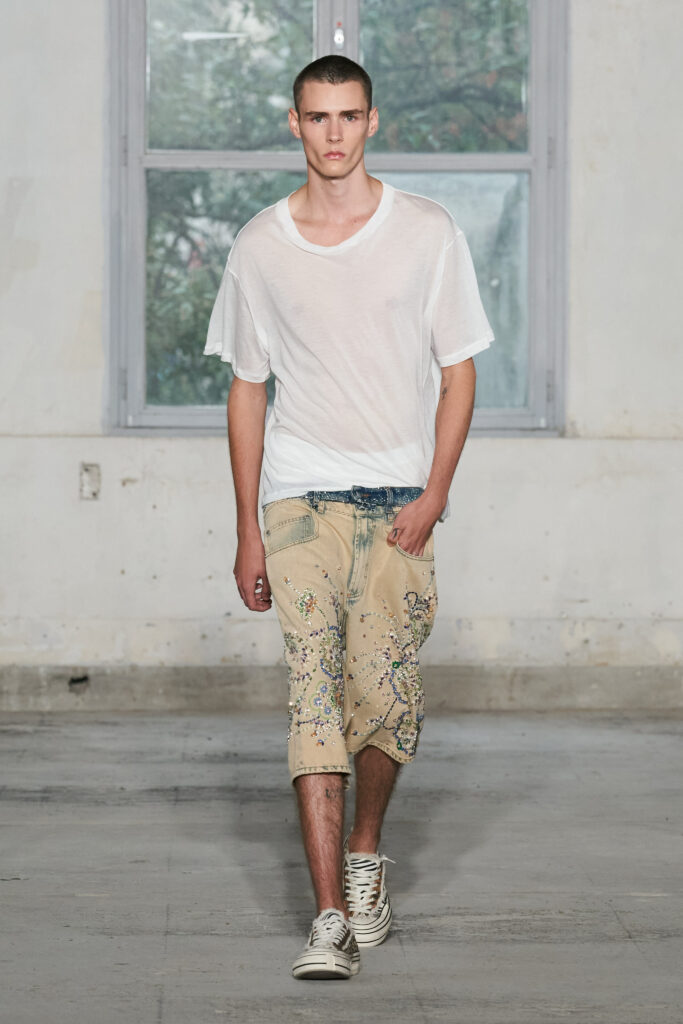 - Un total look jean, avec une jupe midi et un bermuda brodés de fils dorés dans les moindres détails : la preuve que l’artisanat traditionnel peut se marier avec une esthétique urbaine.