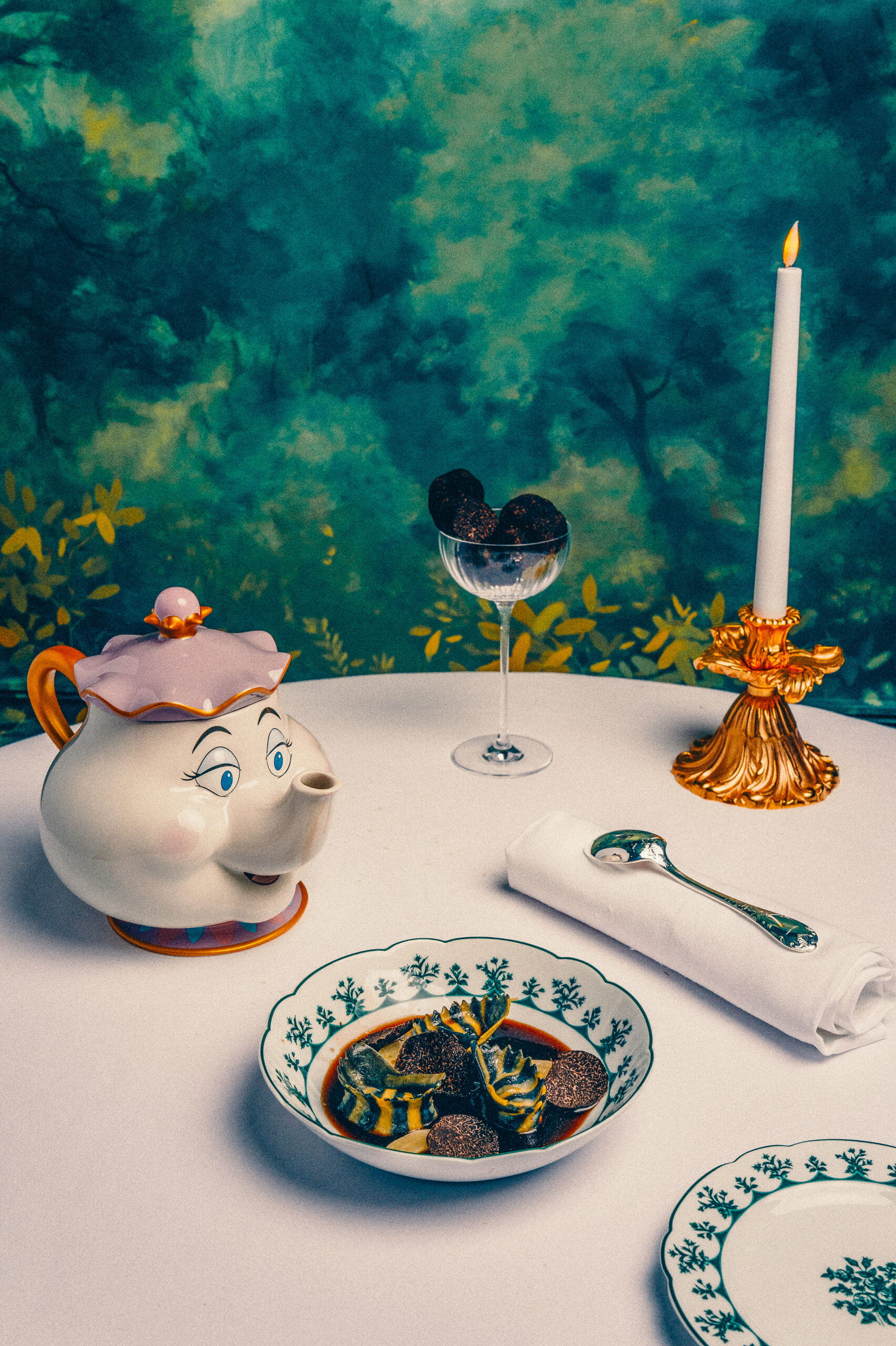 L’évasion débute dès les entrées. Avec « Sous l’océan », inspiré de La Petite Sirène, le chef propose une explosion marine : langoustines délicatement cuites, coquillages façon marinière sublimés par un soupçon de caviar et une gelée marine aux saveurs délicates. Dans un registre plus terrestre mais tout aussi enchanteur, « Le bouillon de Madame Samovar » transporte les palais dans l’univers enchanté de La Belle et la Bête avec des ravioles de légumes racines dans un bouillon parfumé à la truffe.