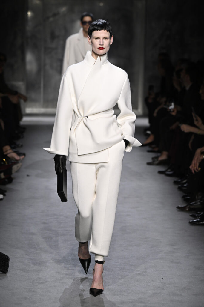 Le jeu des contrastes s’exprime dans la pureté des lignes et l’intensité des teintes : des pastels délicats et des couleurs éclatantes illuminent les étoffes comme une lueur matinale, tandis que le gris et le noir restent les piliers inébranlables de l’esthétique de la marque. Chaque détail respire un luxe maîtrisé, des ornements joailliers aux ceintures architecturales ornées de la lettre emblématique « T ». Le matin après la nuit ne conserve que l’essentiel : la force des silhouettes, l’écho des émotions et l’empreinte des baisers ayant traversé l’obscurité.