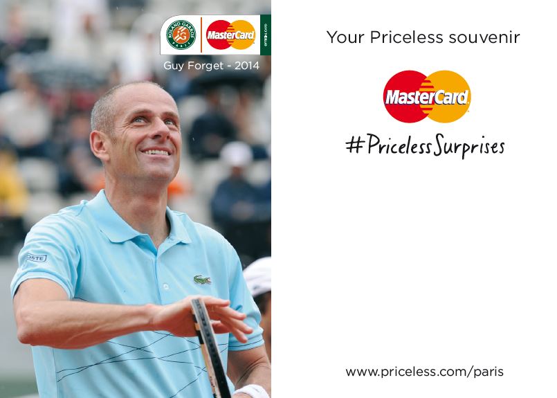 Guy Forget, Légende du tennis français et ex numéro 4 mondial, qui devient cette année l’ambassadeur de MasterCard sur le tournoi, jouera un rôle important dans ce dispositif. Tout au long du tournoi, il ira à la rencontre des porteurs de carte MasterCard et leur proposera de nombreux moments d’échange et entrevues privilégiées. Il animera lui-même une des sessions d’entraînement faisant l’objet d’une Priceless Surprise. Les expériences « Priceless Paris » à Roland Garros sont ouvertes aux titulaires de cartes MasterCard émises en France comme à l’étranger : en effet, depuis quelques mois, de nombreuses offres proposées par MasterCard dans le cadre du réseau Priceless Cities comprenant 38 grandes villes dans le monde sont accessibles à l’international.
