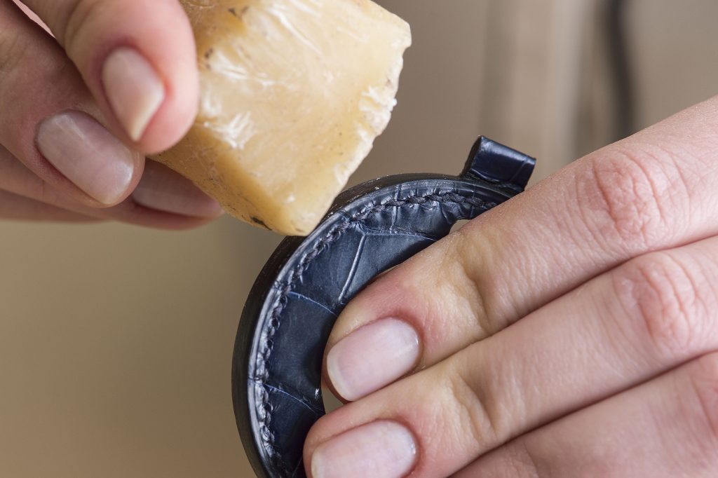 Deux techniques de sellerie sont associées dans ce garde-temps : la couture traversante et la technique dite « plein cuir ». Cette dernière consiste à superposer plusieurs couches de cuir pour créer une épaisseur de 6 millimètre au cœur duquel se loge la montre. L’artisan débute par l’attache qui sert à suspendre la montre de poche. Ce court ruban de cuir forme une boucle en se repliant sur lui-même. Puis, il ajoute de chaque côté du support une épaisseur de cuir de vache plus résistant. Chacune est ensuite recouverte d’une ne découpe en cuir d’alligator lissé et teinté donnant leur aspect nal à ses deux faces.