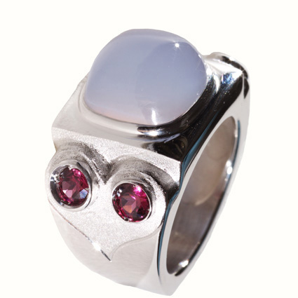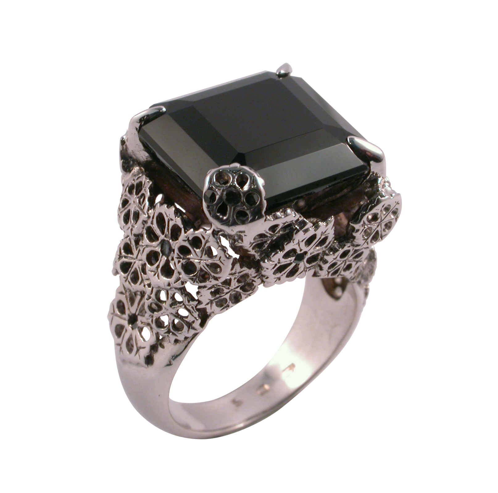 Sa démarche est particulière. Elle a d’abord un coup de coeur pour une pierre et ensuite le bijou se met en place. Ces bijoux sont pour certians excessivement travaillés comme pour la bague Flocons Noirs où des flocons de neige avec diamants noirs sont enchevêtrés autour d’une Onyx majestueuse. Du travail d’orfèvre…