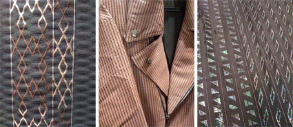 Per noi europei è difficile anche concepire le associazioni materiche presenti in alcuni di questi campioni: fibra di glicine e seta, ad esempio, danno luogo ad un tessuto modernissimo tradotto in un guibbotto a chiodo. Oppure combinazioni di seta e carta in diverse percentuali, per una mano cresposa ma al contempo incredibilmente soffice. O ancora un voile delicatissimo dalla particolare rigidità solo apparente – ricorda il nylon, ma in realtà si tratta di seta sulla cui fibra viene preservata una proteina che invece in occidente si lava sempre via. E per concludere il capolavoro di pazienza e bellezza: un campione in cui sono intessute minuscole tessere di madreperla, tagliata, suddivisa per colore e incollata su sottilissime strisce di carta per poi venire inserita nella trama.