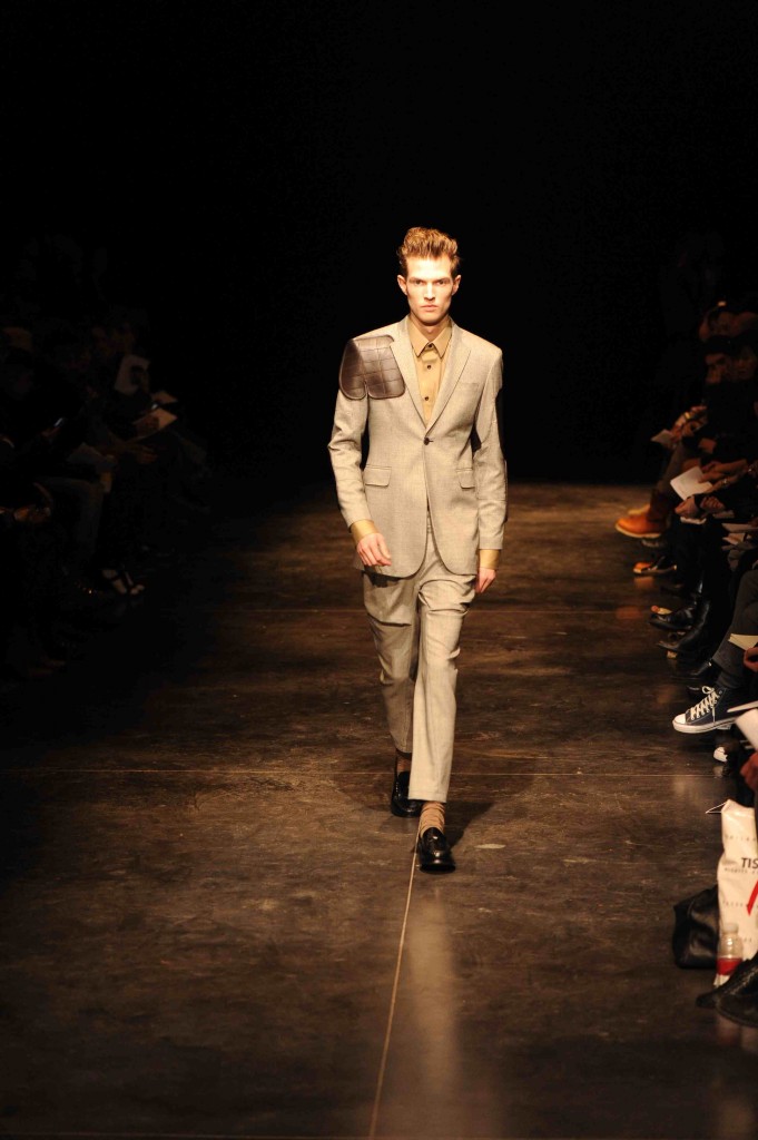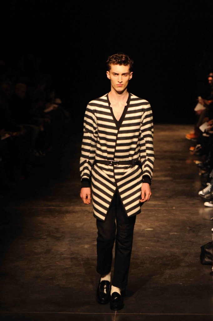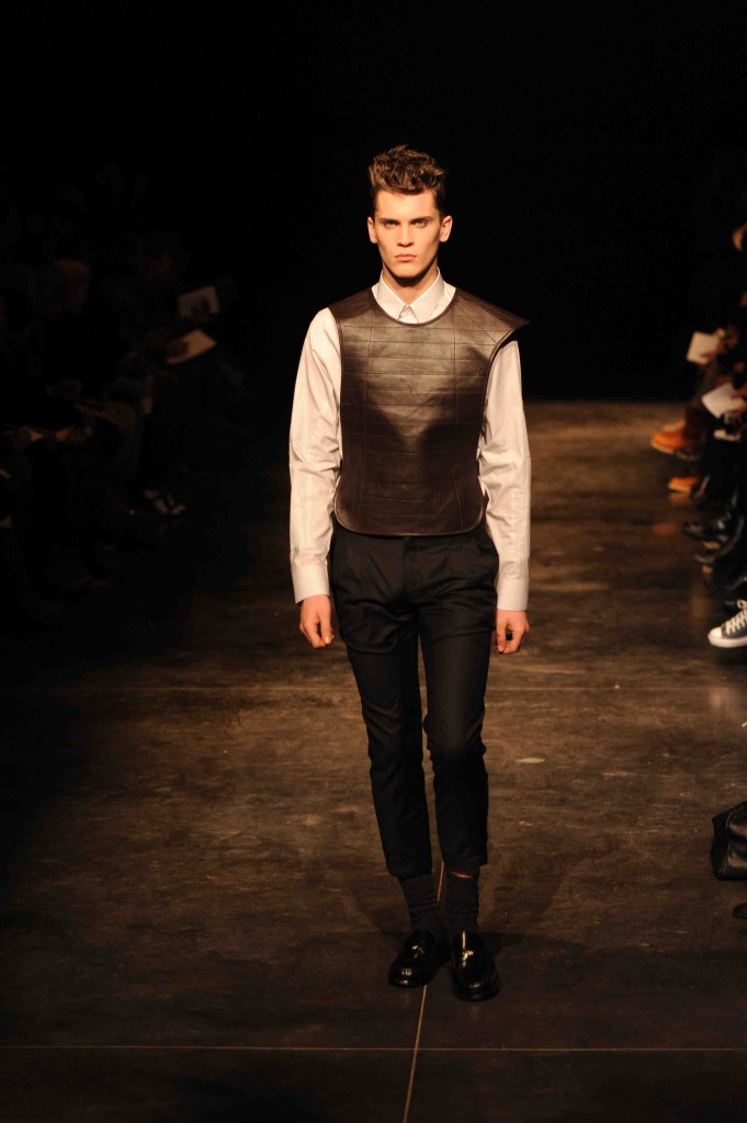 Rebelle, Alcatraz, chez Gaspard Yurkievich le sombre et les rayures sont à l’honneur. Le créateur revisite le costume à sa manière en nous offrant des coupes cintrées et courtes, laissant apparaitre la chaussette du dandy qui le porte, un hommage au grand Michaël peut-être… En tout cas le mocassin est de retour et le boot cut n’a toujours pas été remisé au placard. Les empiècements de cuir qui complètent les vestes de costumes sans manches apportent une touche d’originalité à un vêtement ordinairement classique et la plastron servira de pièce maîtresse dans la collection. Le mâle 2010 est plutôt jeune et actif et en quête perpétuelle de nouveauté. Affaire à suivre.