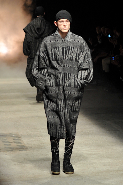 Damir Doma signe une collection cocoonning ceinturée de manteaux oversize à manches hirondelles et ceintures à plusieurs rangs. Du tweed, des peaux, des imprimés zèbres, des pulls écharpes, chez Damir Doma l’hiver se fait façon savane africaine aux couleurs grisées. Les pulls servent d’écharpes et toujours ces pantalons à l’intérieur des boots. Des silhouettes ethniques pour affronter au mieux la jungle urbaine.