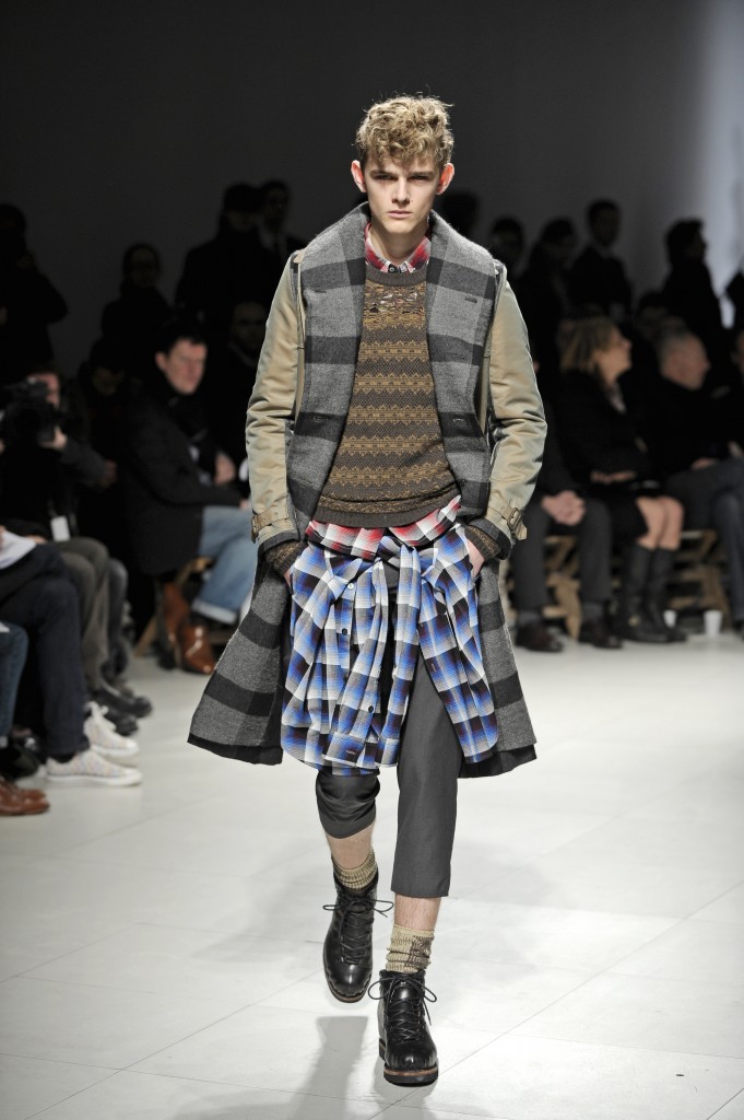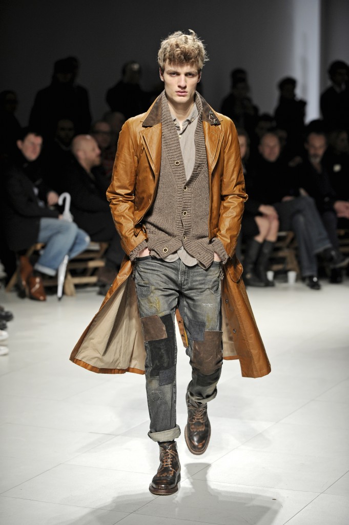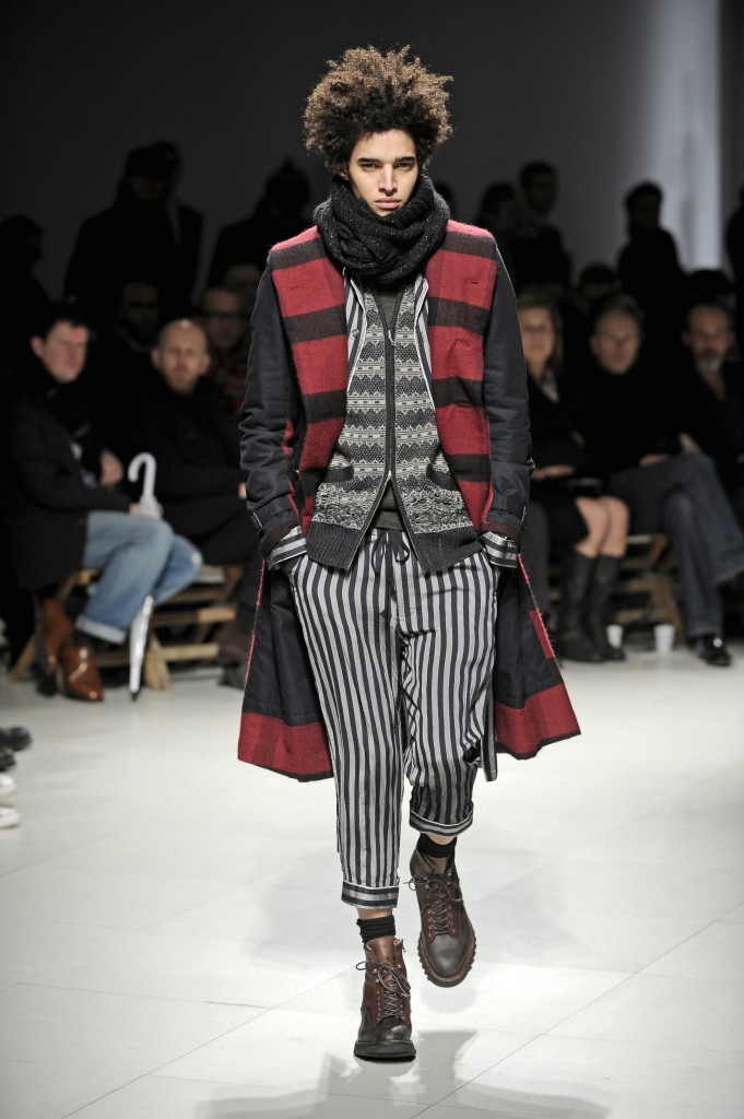 La laine reste le point fort de ce défilé avec une pièce maîtresse : le pull jacquard dont le procédé de fabrication a été créé par Mihara lui-même. Les larges pulls en laine mélangés à du cuir de cheval, recouvrent d’épaisses chemises et les gilets en grosse maille portés telles des vestes, allongent les silhouettes pour un style plus décontracté. Les cardigans en grosse laine ou les pulls un peu plus fins côtoient les costumes. Comme les gilets, ils sont portés de manière nonchalante pas complètement boutonnés. Les blazers portés ouverts sous les manteaux sont également en laine.