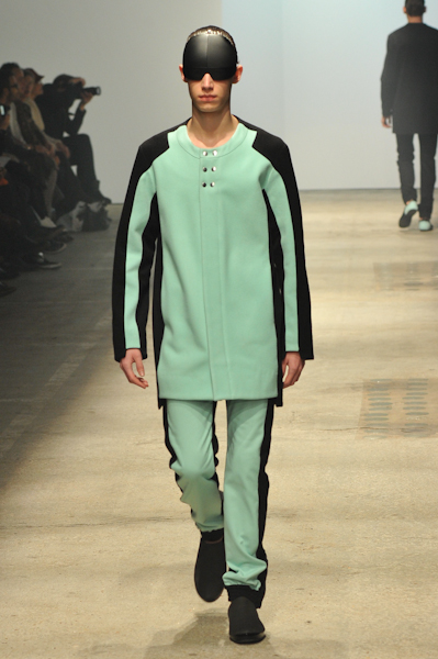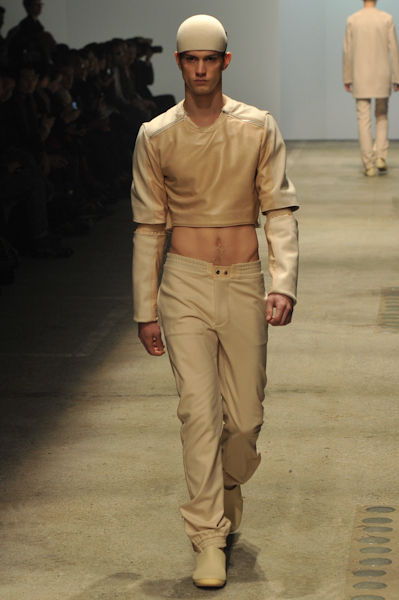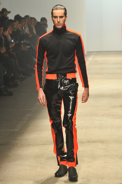 Du beige, du bleu, du noir, du rouge comme dominantes de tons. Du zip et surtout du flashy fluo en veux tu en voilà histoire de sortir de l’ordinaire et de contrer la grisaille hivernale. Avec Romain Kremer, la couture prend tout son sens : symétrie axiale des éléments couture versus asymétrie, les vestes à col cheminée associées aux demi bonnets calots affirment le style du créateur qui n’en est plus à son coup d’essai. Cuir, vinyle et autres « poils » en caoutchouc complètent cette série de vêtements. Des coupes ceintrées sur des pantalons au tombé parfait qui allongent et affinent la silhouette, pour un peu le ventre à l’air en plein mois de décembre paraît presque dérisoire. On a hâte de voir ça dans la rue ! Extra !