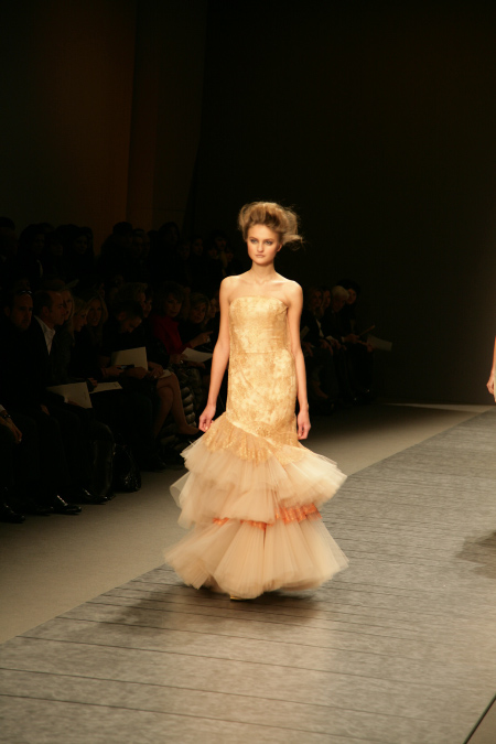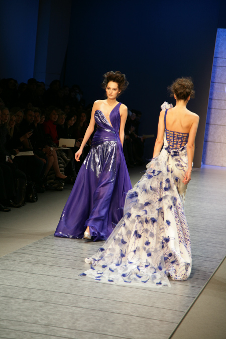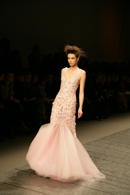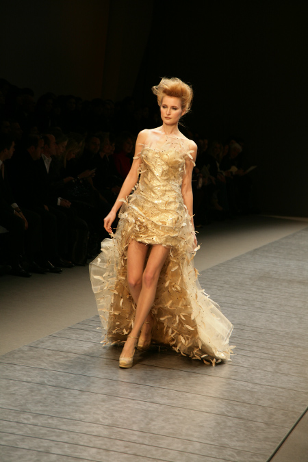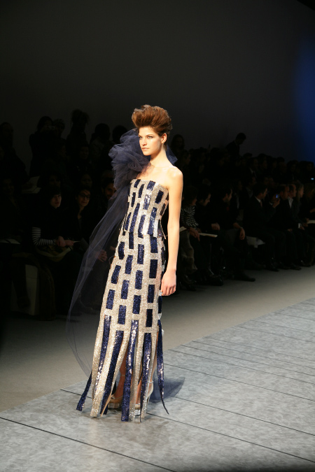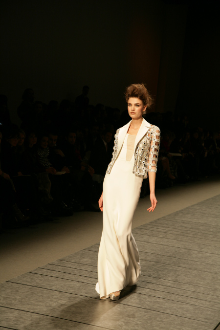 Dans un esprit nude, la robe, pièce phare de la collection, éblouit et enjolive les courbes de la femme tout en  l’illuminant. Un  jeu de matières intéressant , qui s’harmonise avec les coupes sur différentes longueurs. Court, long, mini, sirène, asymétrique, superposition de volume se marient dans un camaïeu de couleurs claires; (écrue, blanc nacré, gris, rose orangé, bleu métallique,  et bien sur, une touche de noir), qui s’accordent en dentelle,  strass et paillettes. Les coupes en crêpe, en gazar, grillage, bustier, baleiné s’amourachent de drapée, tressée, en organza, tulle, mousseline ou encore satin de soie.