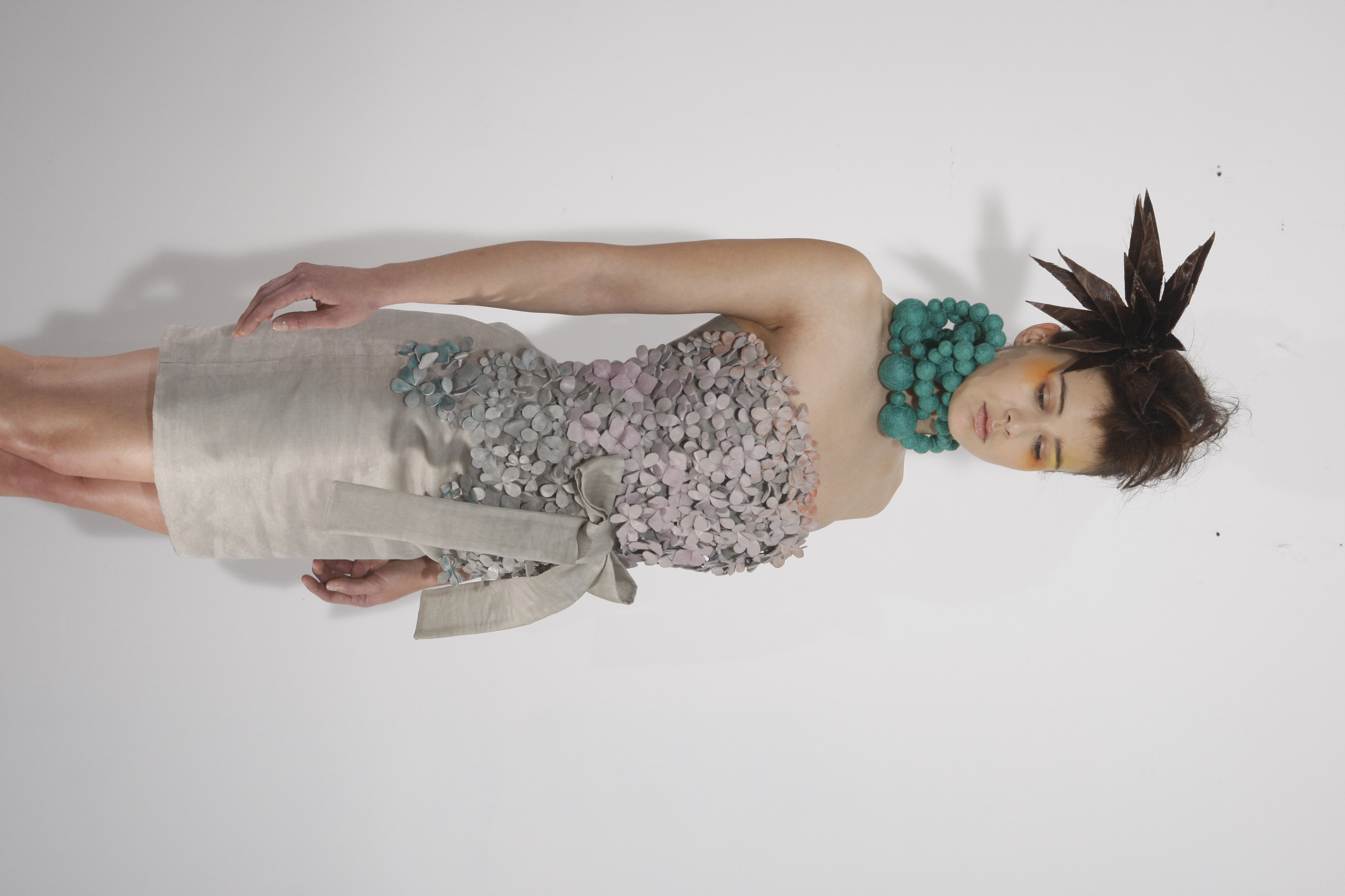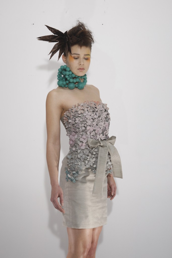 Cette saison, le détail est de taille : les robes bustier épousent les formes du corps mais au fil des passages, les modèles se transforment et changent de couleurs. La collection joue sur l’apparition et la disparition de couleurs, de broderies. Le vêtement possède son existence à part entière et va devenir une partie intégrante du corps de la femme. Il va réagir alors au chaud et au froid comme par magie.