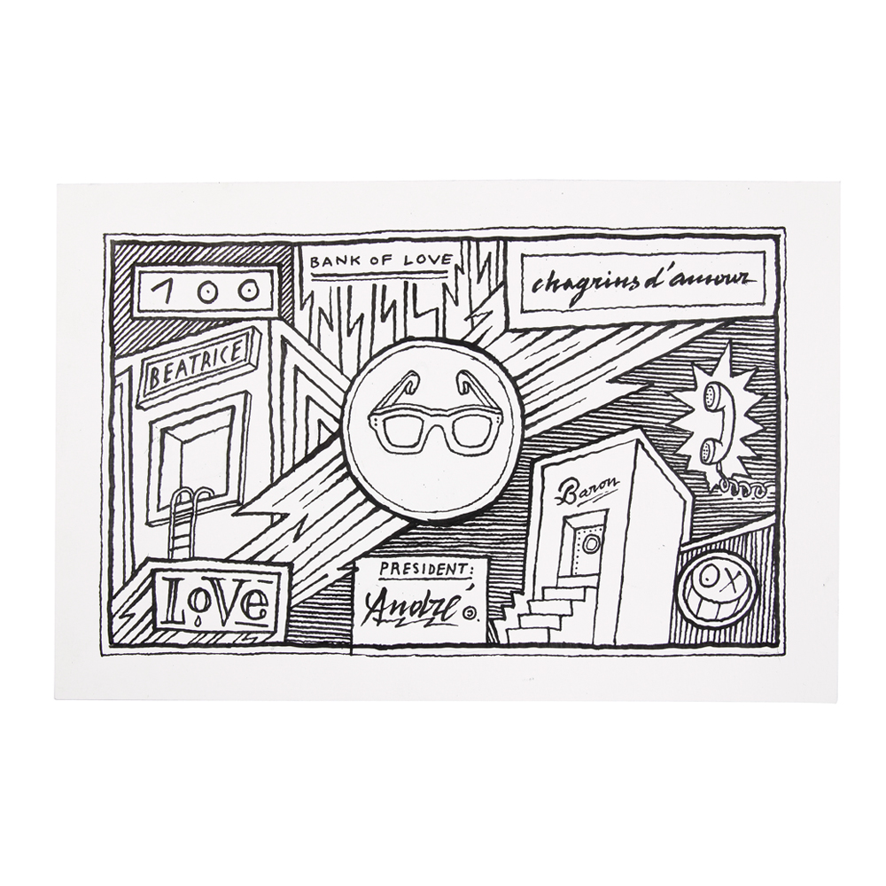 « Cette série est inspirée par l?imagerie de l?amour psychédélique des années 60?s et 70?s, mélangé au souvenir qu?il a des bandes dessinées qu?il lisait petit. Dans le monde d?André, ses dessins sont une sorte de monnaie, comme des billets doux pour s?échanger l?amour. Pour lui la solution, pour étouffer cette énorme couche de capitalisme, à l’intérieur ou hors du milieu de l’art, réside dans ce qui ne peut s’acheter – l’amour et la générosité. » comme le dit son ami et collègue de Purple Magazine Olivier Zahm.