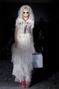 Des robes de mousseline ou de soie, bordées de tulle mais également des mini bustiers à volants ou encore les célèbres tee shirts Lanvin relookés en mode « happy couple » pour l’occasion. Des croquis d’Alber Elbaz en veux-tu en voilà, et tout d’un coup on se retrouve devant l’autel en Carrie Bradshaw super cool.