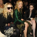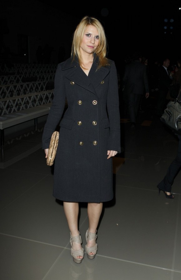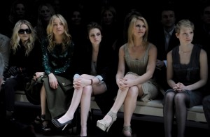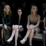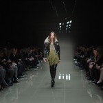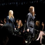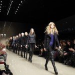 Burberry nous emmitoufle en rendant hommage à son histoire vieille de 150 ans, jouant l’esprit aviateur et militaire. Structures nettes et chiquissimes pour les parkas, les manteaux officiers, jeux de volumes particulièrement dans les blousons à double voire triple cols , mariage des peaux retournées et du cuir, magnification et exagération du fonctionnel (zips, boucles de ceintures, boutons démultipliés notamment au niveau des manches). La silhouette en impose mais les colossales cuissardes sur vertigineux talons aiguille assurent le contrepoint ultra féminin pour une allure au final affirmée mais très sexy. Les mini mini jupes du Printemps / Ete sont descendues au genou mais réitèrent l’élégance du drapé de la belle saison, ou le volant . Les bruns, beige et marine dominent mais s’acoquinent à de lumineux violine, vert et jaune (moutarde, s’il vous plait!). Le manteau proposé au final, patchwork de fourrures, est simplement à se damner.