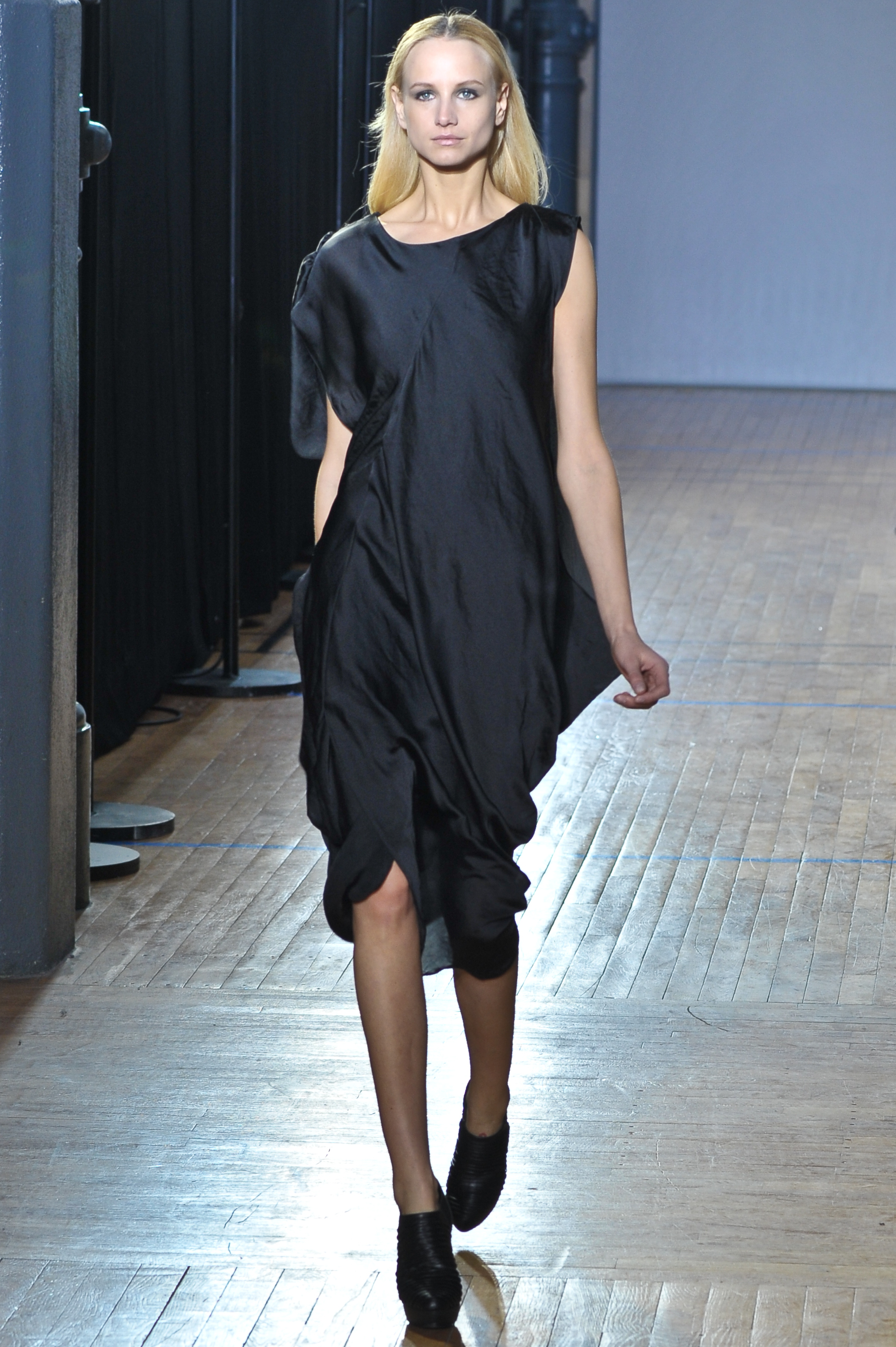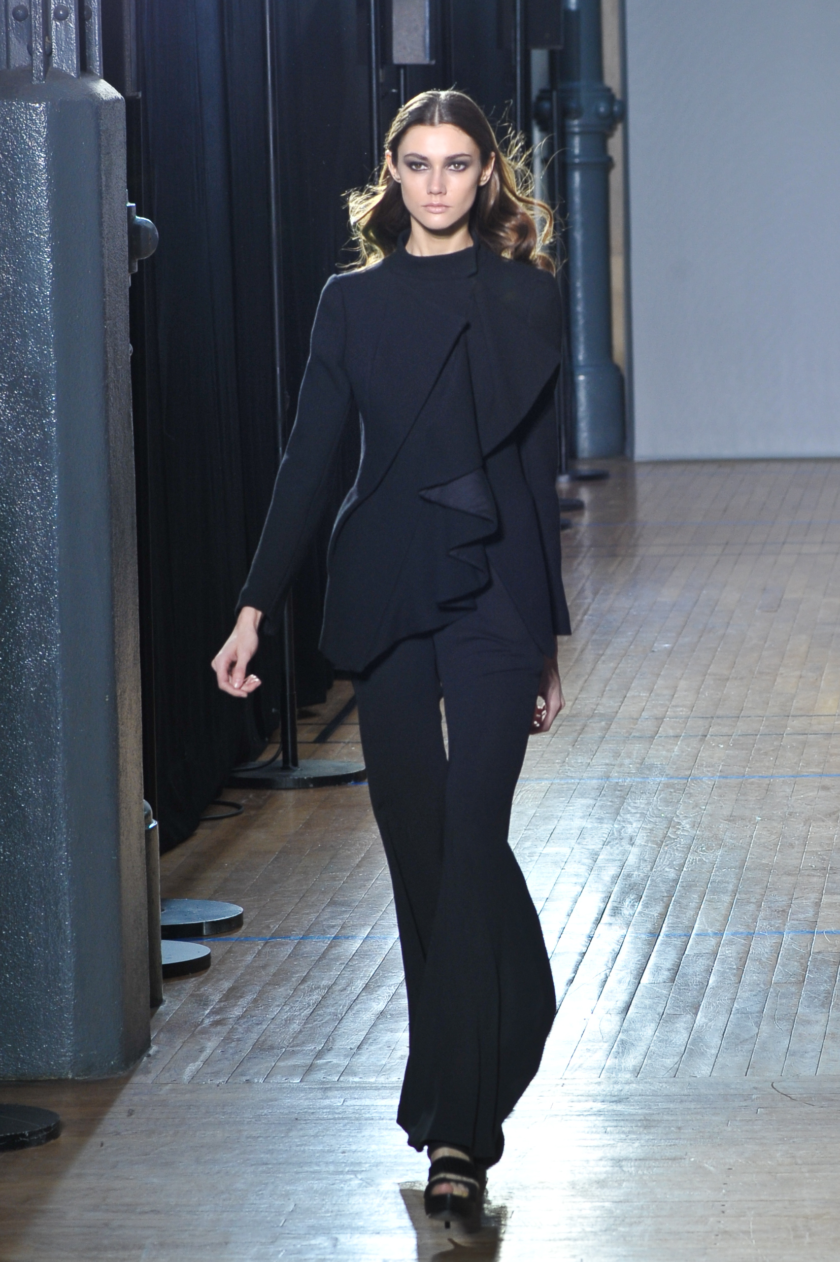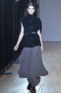 Le créateur portugais nous présente une collection qui réinvente et réinterprète les classiques de la mode contemporaine dans des tons sobres du noir au gris dégradé, à la fois ascétique et chic. Les faux-noirs sont multipliés et on peut apercevoir plusieurs pièces pétrole, plomb ou olive voire bleu côtoyer de vrais noirs intenses. Des matières fortes comme le cuir ou la laine sont mixées avec d’autres matières plus délicates telle que la mousseline ou la dentelle.