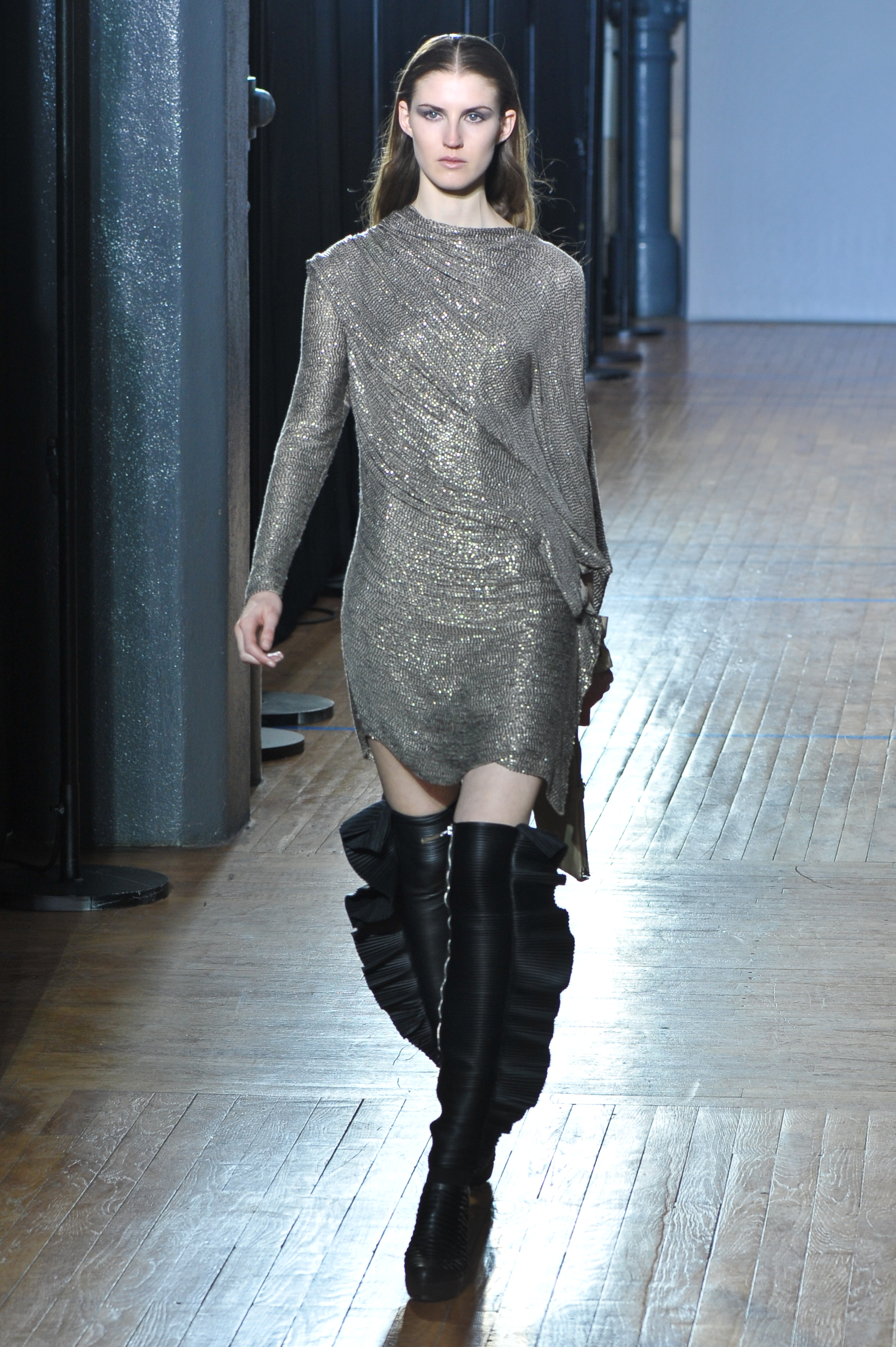 Les boots se font divinement hautes et allongent les silhouettes proposées par le créateur. Elles se portent ouvertes sur le devant ou complètement fermées, sanglées mais toujours sur talons aiguille. Luis Buchinho continue sur sa lancée de sirène urbaine en réinventant la botte et la cuissarde. Il ajoute à son modèle de boots des volants en cuir sur chaque côté de la botte sanglée et ouverte devant, renforçant de nouveau l’idée de nageoires dorsales.