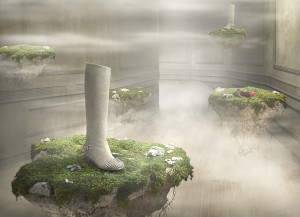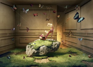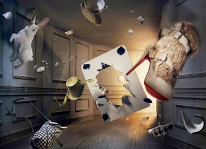 Le photographe Kuong Nguyen fait donc côtoyer escarpins bottes et bottines avec le petit soldat de plomb, les sept petites souris ou encore le lapin blanc d’Alice.