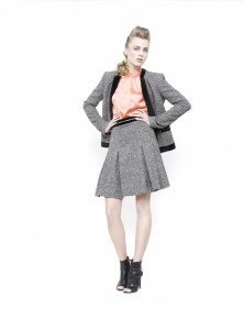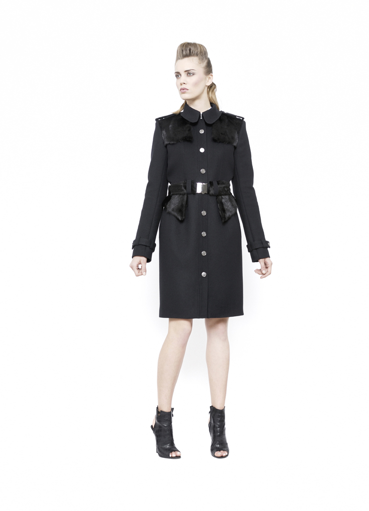 Elle nous donne sa propre version de la tendance militaire à travers des manteaux en cachemire et chevrette ou astrakan directement inspirés des manteaux du KGB. Elle réhabilite le tailleur short qu’elle propose en laine taille haute avec une veste toujours d’inspiration militaire réchauffée par des ajouts de velours sur les épaules et les boutons. Là encore son goût pour le mélange des matières fait furieusement effet, comme pour ses robes et ses tailleurs jupes : le tweed se marie avec plaisir avec le velours, qui lui côtoie sans problème la laine chevron.