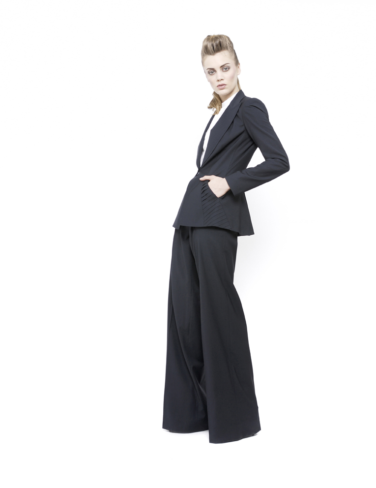 Pour cet hiver, elle remet au goût du jour le tailleur pantalon qu’elle imagine noir en laine avec un pantalon très large, à porter de jour en version décontractée avec une blouse en satin de soie comme de nuit en version plus sophistiquée. Elle en propose une autre version plus classique droite en velours où la veste à manches courtes cette fois se pare de cristaux Swarovski.