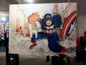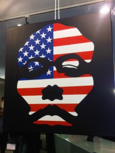 Tout pourrait être résumé dans l’oeuvre Yes, We can spray de Speedy Graffito. Car à elle seule, cette évocation de tout ce qui fait l’Amérique de Mickey au dollar en passant par Barack Obama, Captain America, Catwoman et le graffiti montre la puissance du mythe. Cette nouvelle bannière étoilée mixe très brillamment l’ensemble de ces petits bouts d’Amérique qui nous nourrissent et auxquels la bannière étoilée In God We trust de Jonone, pilier du street-art, fait furieusement écho. Tout comme le visage sombre et énigmatique de la bannière Open You Eyes America d’YZ dont le parcours est jalonné par sa rencontre avec New-York, ville emblématique. L’America de Dize semble presqu’irréelle à côté.