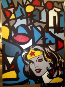 Celui peut-être le plus fort. Entrons dans le monde du super héros. Auuuuuuuuuuuuuuuu Secours, Captain America ou Wonder Woman accourront pour vous sauver alors. Tout est dit à travers cette fresque monumentale regroupant tous les super héros réalisée par Nicolas Moreau. Nul besoin est d’en ajouter, cette peinture nous dit tout avec sa multitude de super héros (ou de losers) de bandes dessinées ou de dessins animés… Le Super G Surfeur semble être un véritable pied de nez au super héros flamboyant surfant sur la vague.