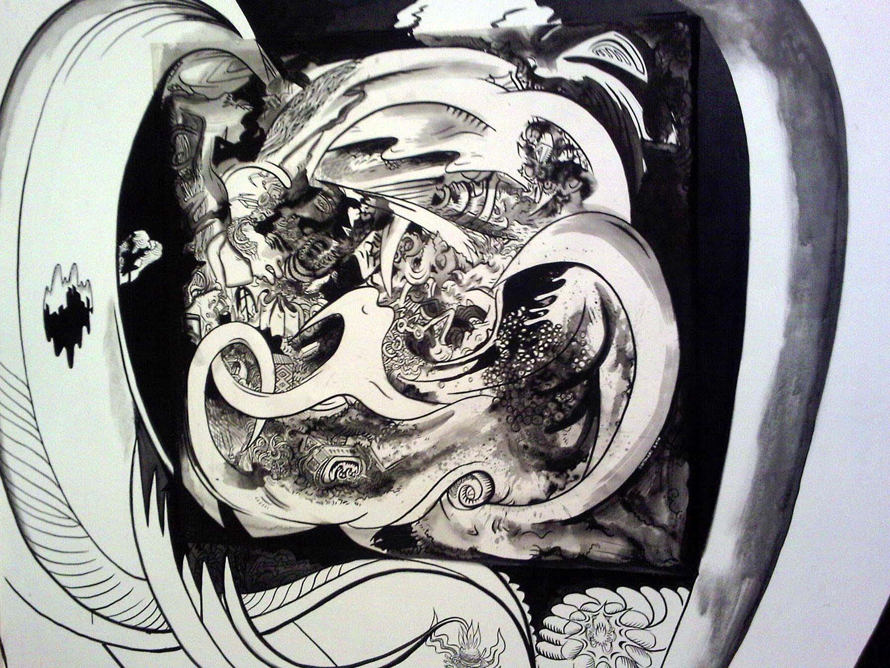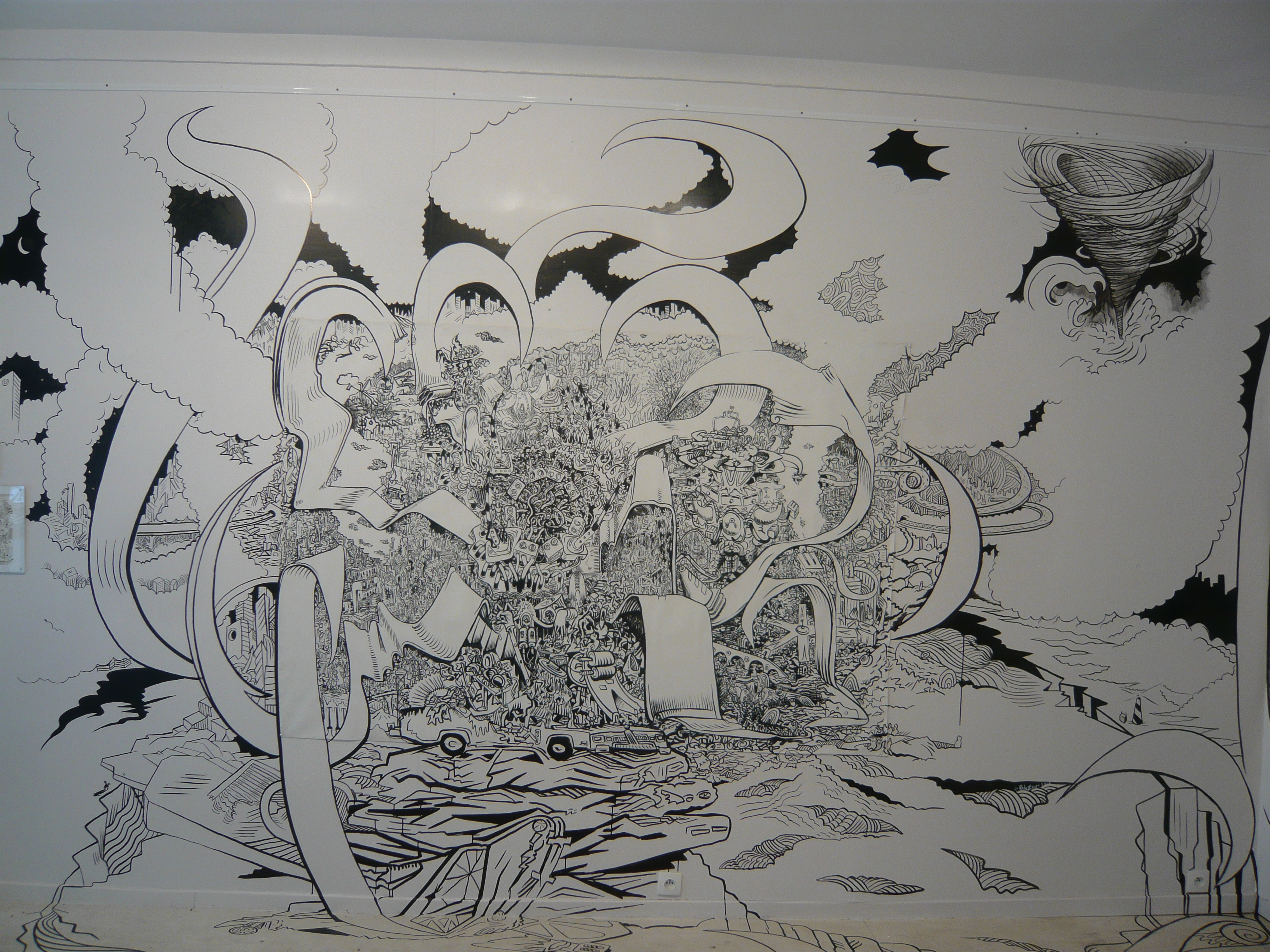 Mais l’oeuvre la plus saisissante reste celles de Paul Santoleri, artiste prolifique originaire de Philadelphie dont le souci du détail dans ses dessins en noir et blanc frise la perfection. Inspiré par la nature, l’artiste peint un univers surréaliste, des passiflores ou des méduses, pour adoucir l’architecture des villes. On en ressort presqu’happé dans ce monde, nouvelle mégapole plus naturelle, allégorie d’une ville tentaculaire.