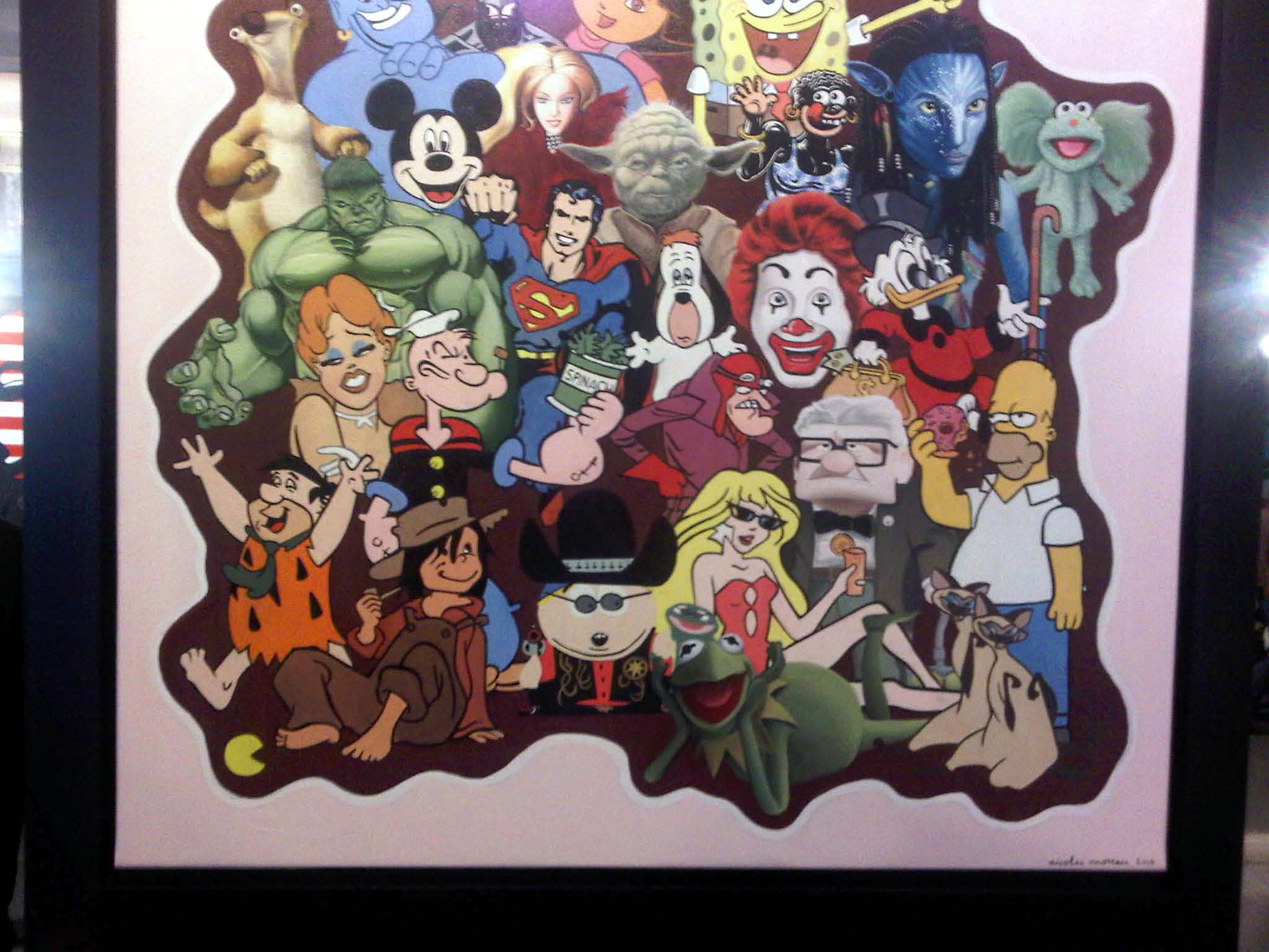 Celui peut-être le plus fort. Entrons dans le monde du super héros. Auuuuuuuuuuuuuuuu Secours, Captain America ou Wonder Woman accourront pour vous sauver alors. Tout est dit à travers cette fresque monumentale regroupant tous les super héros réalisée par Nicolas Moreau. Nul besoin est d’en ajouter, cette peinture nous dit tout avec sa multitude de super héros (ou de losers) de bandes dessinées ou de dessins animés… Le Super G Surfeur semble être un véritable pied de nez au super héros flamboyant surfant sur la vague.