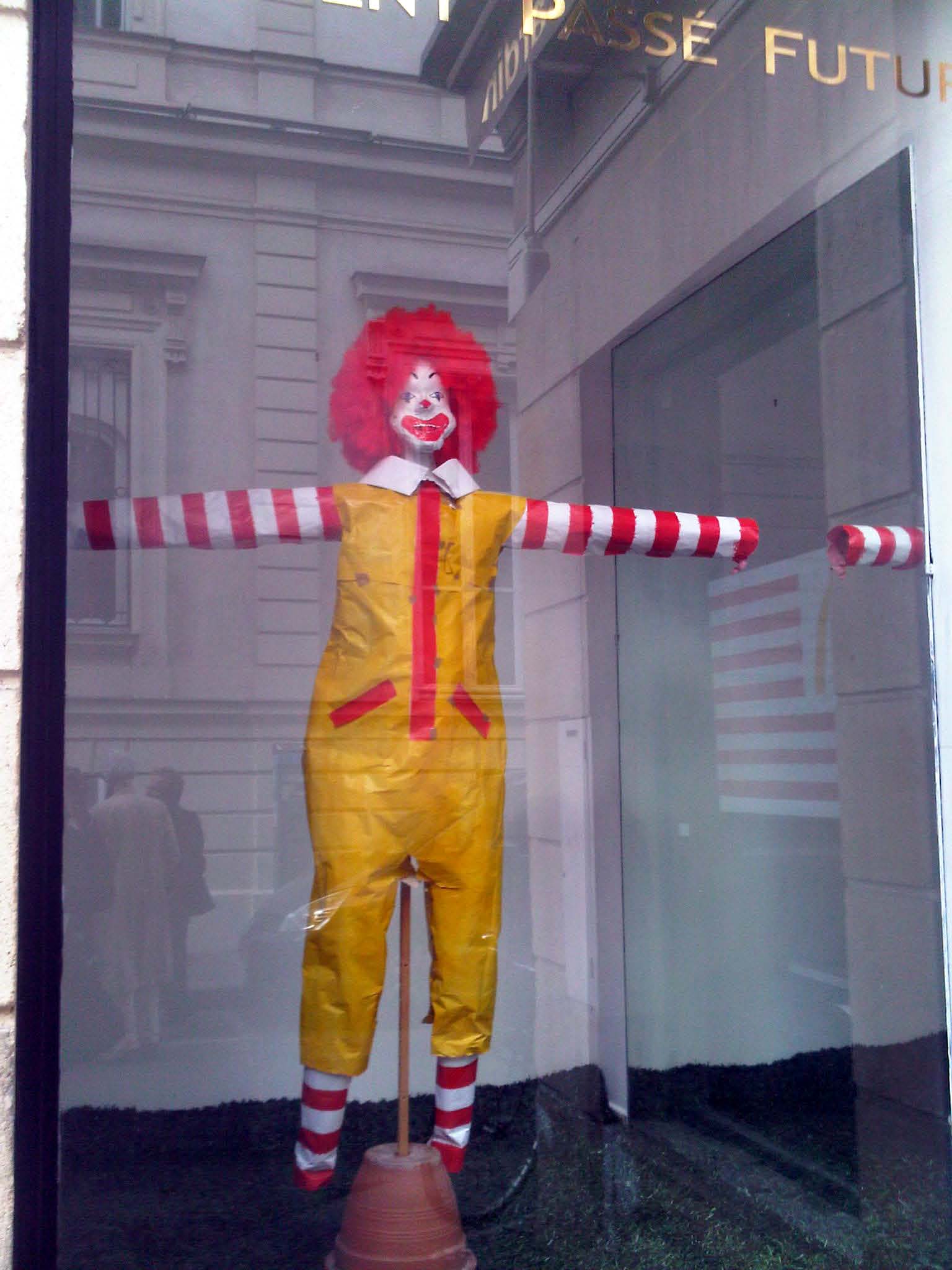 Au travers d’une vitre, on peut observer le Ronald MacDonald du Studio 21bis inquiétant tel un épouvantail, symbole d’une nourriture uniformisée et aseptisée.