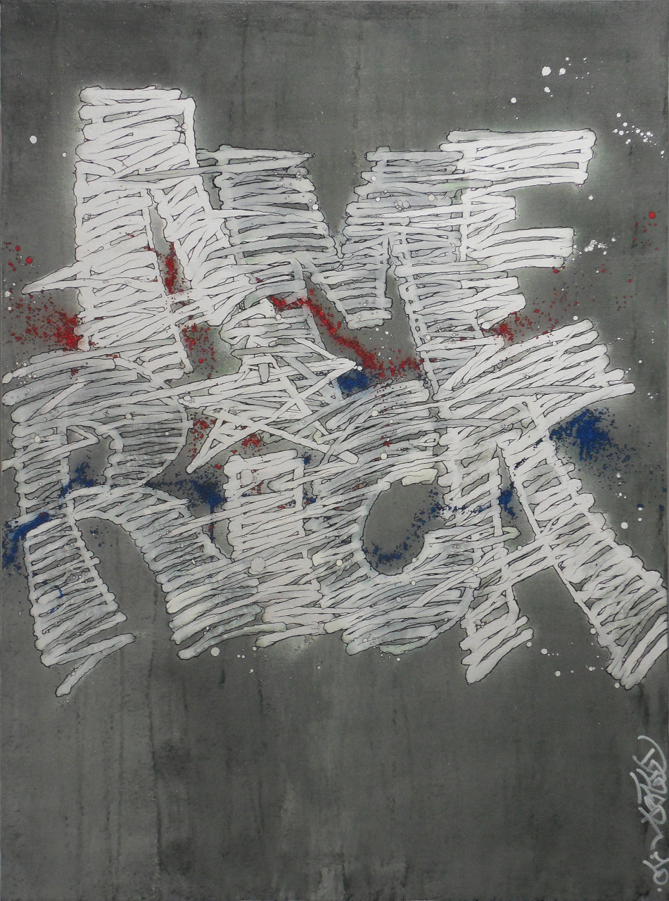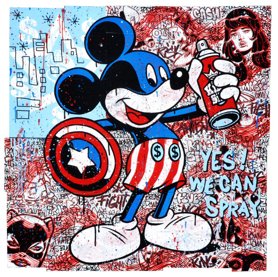 Tout pourrait être résumé dans l’oeuvre Yes, We can spray de Speedy Graffito. Car à elle seule, cette évocation de tout ce qui fait l’Amérique de Mickey au dollar en passant par Barack Obama, Captain America, Catwoman et le graffiti montre la puissance du mythe. Cette nouvelle bannière étoilée mixe très brillamment l’ensemble de ces petits bouts d’Amérique qui nous nourrissent et auxquels la bannière étoilée In God We trust de Jonone, pilier du street-art, fait furieusement écho. Tout comme le visage sombre et énigmatique de la bannière Open You Eyes America d’YZ dont le parcours est jalonné par sa rencontre avec New-York, ville emblématique. L’America de Dize semble presqu’irréelle à côté.