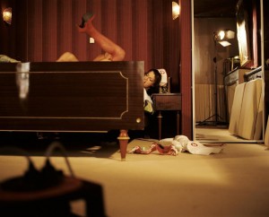 Ulrich Lebeuf /Agence MYOP nous a présenté l’Antonyme de la pudeur, backstage étonnant de tournages de films pornographiques. Le photographe nous présente une vision aseptisé du porno mais surtout énormément distancé, rien d’explicite n’est laissé aux yeux des spectateurs. Ulrich reste à distance ou saisit les à-côtés, les corps sont poussés à la marge ou laissés dans l’ombre donnant la part belle parfois au décor, à la lumière. Seules certaines émotions, certains regards sont laissés transparents de vérité. Les femmes alanguies ressemblent à des poupées gonflables tant elles semblent désincarnées et loin de ce qu’elles font.