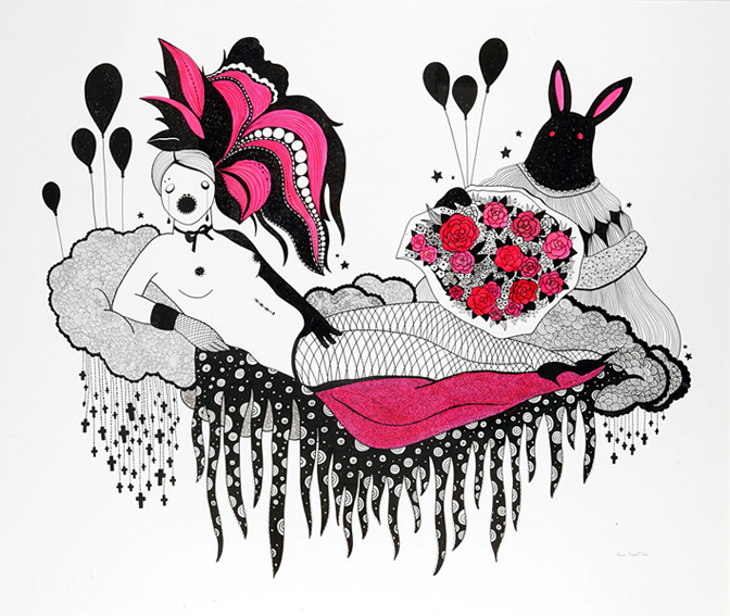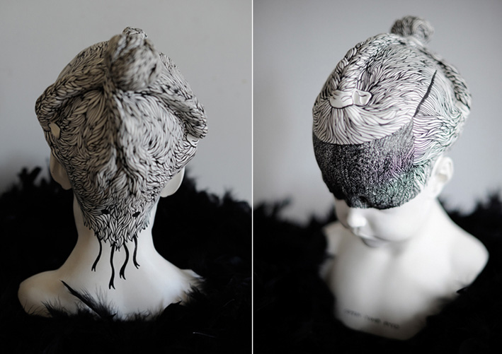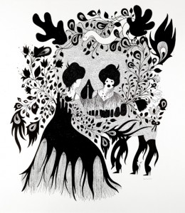 Graphisme proche du tatouage, détail d’écailles sur les sculptures ou fresques proches des estampes japonaises; romantisme purement gothique ou bien manga plein de délicatesse, aucune étiquette ne semble pouvoir coller au style de l’artiste. A la fois dessinatrice, illustratrice et peintre, elle arrive à tous les réunir dans un style résolument moderne et plein de personnalités.