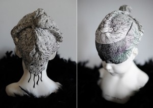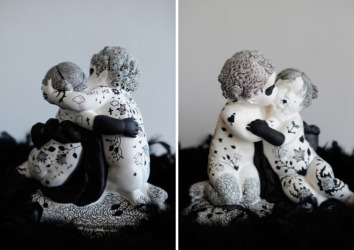 Dans les vitrines, ici et là, plusieurs de ses sculptures « décorées » nous happent. Entre tatouage à l’encre noire et écailles, les petits détails habillant ces petits anges « LOVE ME, HATE ME » – serait-ce une référence déguisée à la nuit du chasseur ? – ou encore cette tête de femme « OPEN YOUR EYES » recréent un habit de peau comme une protection devant la cruauté de ce monde. Enlevons le voile qui couvrent nos yeux et regardons-nous telles que nous sommes semblent nous dire Anne.