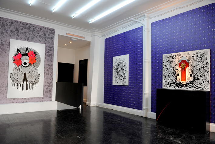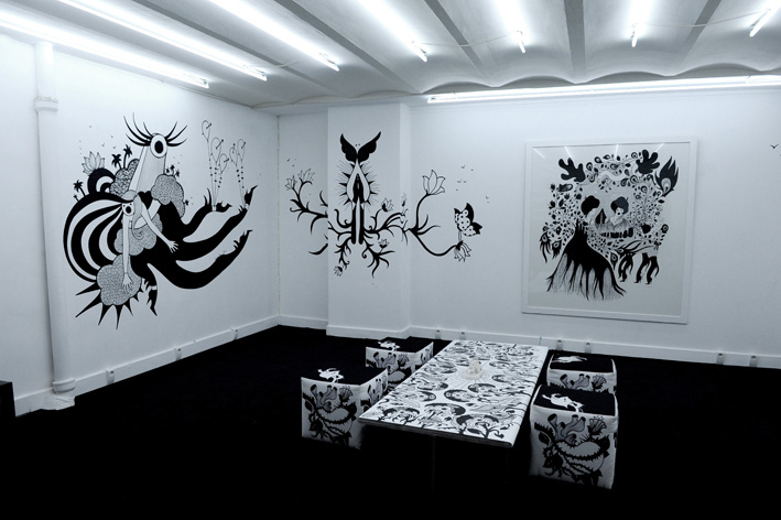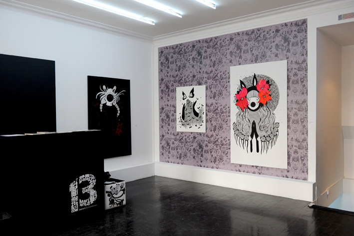 Ses toiles côtoient sans problème de petits bustes blancs d’anges ou de femmes qu’elle a délicatement tatoués d’encre noire avec le même soin et la même application que pour ses toiles. Grandes fresques monochromes à même le mur ou peintures sur toiles, poufs carrés et table basse entièrement décorés à la main, et papiers peints très colorés, aucun support ne semble pouvoir empêcher l’artiste de nous délivrer son message. Il y en aura pour tous les goûts et surtout pour toutes les sensibilités.
