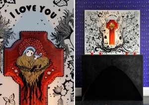 En pénétrant dans la Galerie, on est toute suite attiré par son autel « I LOVE YOU », entre dévotion religieuse et hommage à l’amour. Nouvelle chapelle ardente ou représentation moderne du Sacré Cœur, cet autel fascine avec son crucifix rouge qu’on croirait directement pris dans les flammes de cette petite cheminée noire faisant office d’autel qui, à y regarder de plus près, est elle aussi composée de petits détails entre gravure et tatouage. Sommes-nous finalement prêts à célébrer le culte de l’amour, acceptons-nous les blessures occasionnées par l’amour ?