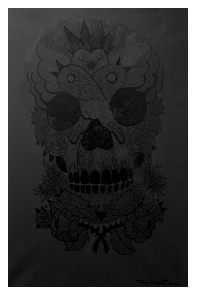 Mais le talent d’Anne Brunet explose dans l’œuvre la plus riche et la plus forte de cette exposition, une splendide huile sur toile, vanité des plus brillantes et véritable démonstration du savoir faire de l’artiste. Noire et sombre, elle intrigue et on s’approche afin de mieux voir. Et là, une foule de petits détails apparaissent un à un. On se surprend à les deviner, à recomposer, à repenser cette vanité en y cherchant des symboles mais surtout en se racontant de nouvelles histoires. Ici, des oiseaux surgissent à la place des sinus, des ailes d’ange se cachent dans les arêtes du nez mais là ne serait-ce pas un cœur à la base du menton. Et chacun de ces détails en révèlent d’autres à leur tour rendant cette toile fascinante, c’est un véritable puzzle artistique. Est-ce par ce qu’elle souhaite qu’on apprécie son art qu’elle a simplement nommé cette toile « LOVE ME » ?