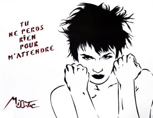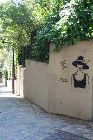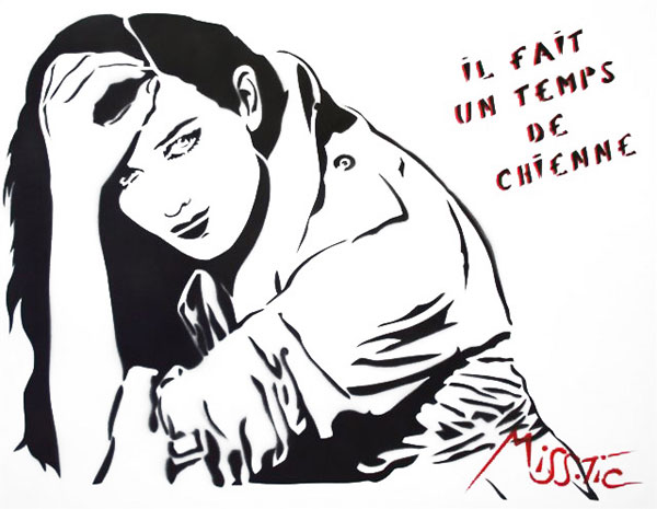 Miss. Tic est la première mais non la moindre. Par un dimanche après-midi, faisons une petite promenade parisienne dans les rues du quartier de la Butte Aux Cailles. Tout le long de nos déambulations apparaissent sur différents murs des silhouettes de femmes créées à la bombe accompagnées de savoureux jeux de mots. Ces silhouettes élaborées au pochoir en une seule couche sont l’œuvre de Miss. Tic et sont emblématiques du style pochoir.