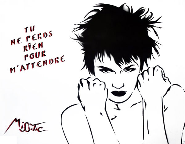 Miss. Tic a découvert l’art du graffiti en Californie où elle a habité deux ans. Elle a commencé la peinture au pochoir sur les murs en 1985 et depuis n’arrête plus. Campagne pour la marque de location de voiture UCAR, affiche de film pour « La fille coupée en deux », son art ne cesse de s’exprimer au gré de ses envies de femme.