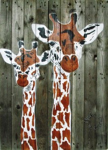 Parfois, au gré de mes pas sur les pavés parisiens, au détour de carrefours, je me suis retrouvée nez à pied avec des girafes à même le trottoir. Ces girafes étaient signées Mosko et associés. Derrière Mosko et associés se cachent deux artistes, Gérard Laux et Michel Allemand qui ont choisi de lâcher les animaux du zoo dans les rues de Paris. Girafes, tigres, gazelles ont envahi les murs en redonnant vie et couleur au quartier de la Moskowa, qui jouxte la petite ceinture du 18e arrondissement de Paris. Ils recouvrent la jungle urbaine de leurs animaux hauts en couleur dans un message simple : ils veulent mettre du beau, de la gaieté et de la vie là où il y a du laid, du sombre et des ruines. Mosko et associés s’est spécialisé dans la peinture d’animaux exotiques devenant ainsi leur marque de fabrique. Ils décident également de poser leurs pochoirs essentiellement sur des lieux en déperdition. Ainsi ces animaux poétiques rendent aux bâtiments et aux habitants leur couleur. Leur bestiaire s’enrichit au fil des années de nouveaux spécimens pour notre plus grand plaisir.