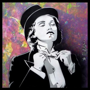 Mr. Lolo est une belle découverte. Ses œuvres s’inspirent, entre autres, des personnages mythiques de cinéma : Katherine Hepburn, Bette Davis, Marlène Dietrich. Il les convoquent tous pour clamer son amour de ce cinéma hollywoodien des années 1940 et 1950, entier dans une image très proche de la photographie, très glamour. Ses « toiles » sont colorées, d’une précision sans pareil, maîtrisant à merveille les ombres et les lumières, les couleurs et les volumes dans un style proche du pop art. Mais son exercice le plus fort à mes yeux sont ses vanités, brillant exercice de style coloré et tellement fort avec ces insectes sortant de ces crânes. Tout est fait à la bombe et au pochoir, jusqu’à la moindre nuance de pourpre…