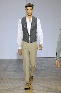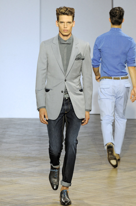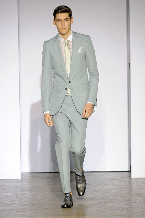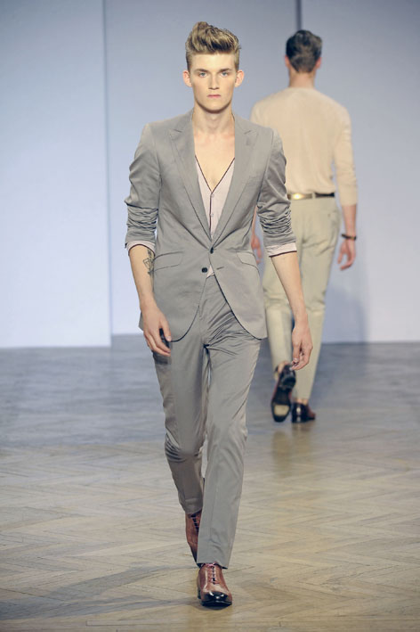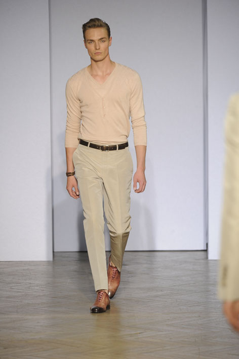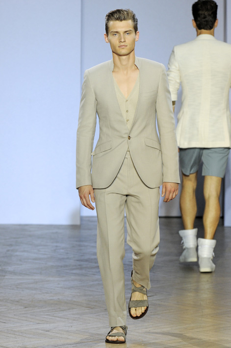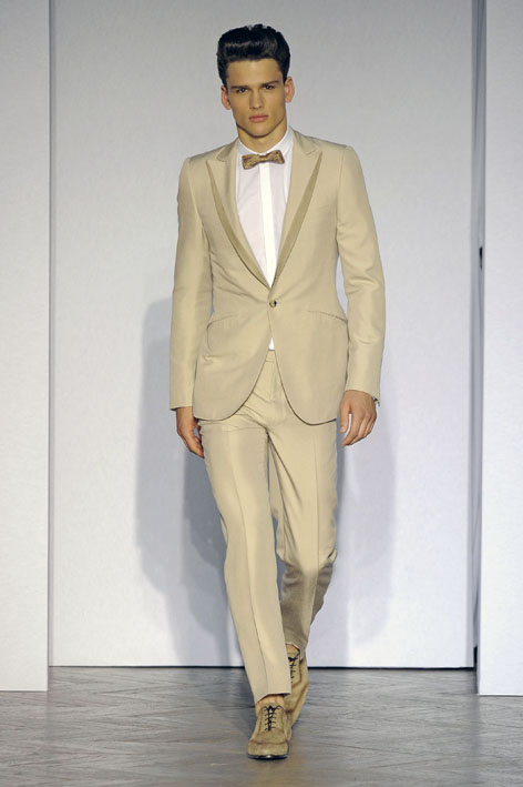 Le dandy Smalto aime les costumes ajustés dans des teintes sable, gris ou bleu pastel, une fine écharpe lovée parfois autour de son cou. Porté avec une chemise ou une simple maille, ce nouveau tailleur révèle une élégance naturelle sans détails ostentatoires, comme pour ce costume aux tons taupe porté avec une petite maille fine et une simple paire de sandales. Youn Chong Bak maîtrise parfaitement son sujet et s’autorise un nouveau smoking beige de toute beauté porté avec des mocassins bicolores dans les mêmes tons.