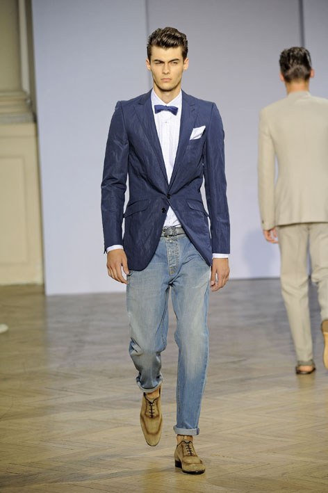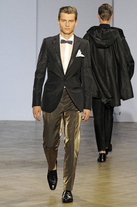 L’homme Smalto aime les juxtapositions de matières où le jean côtoie des matières plus nobles. Associé à une veste de smoking et un nœud papillon, il devient le » jean couture ». Cette silhouette inattendue est un hommage appuyé au tailleur historique de la maison Smalto dont il reprend les codes. On retiendra l’ultra élégance de la veste de smoking noire portée avec un nœud papillon sur un pantalon enduit de particules dorées, noeud papillon à porter en toutes circonstances aussi bien en journée qu’en soirée.