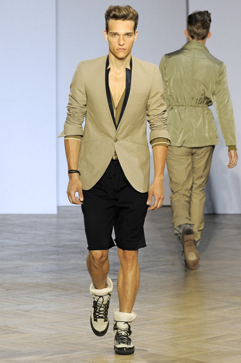 On retrouve avec plaisir l’allure sportive chic si chère à Youn Chong Bak : coupes-vent, impers et sahariennes cohabitent avec le pantalon de ville ou le bermuda dans des coloris clairs simplement portés avec des sandales.