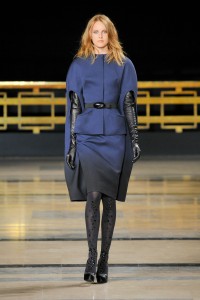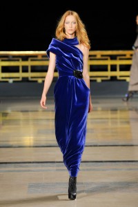 Le velours est magnifié dans un bleu électrique inoubliable, rappelant l’intérieur de boîte à bijoux. On reconnaît les matières fétiches du créateur : le jersey et le crêpe de laine, le cuir, le satin, matière qu’on retrouve également sur les chaussures.