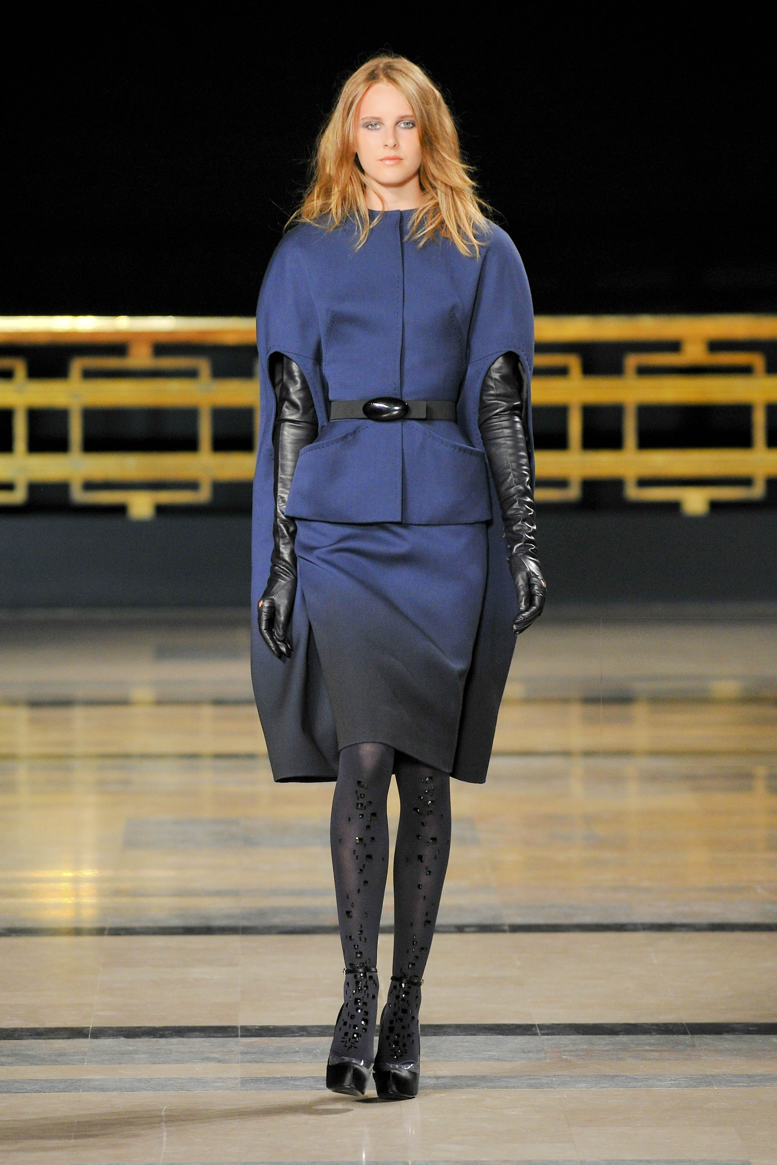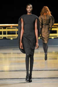 En effet, la collection Hiver 2010-2011 de Stéphane Rolland a d’abord été inspirée par des formes très rondes lui rappelant les galets polis de son enfance. De la boucle de ceinture à la forme de tailleur, le galet est presque omniprésent dans toute la collection. Se référant au travail du sculpteur contemporain Anish Kapoor et de son fantastique Cloud Gate, le créateur français nous propose le tailleur Cocon en double crêpe de laine,une robe tailleur d’inspiration années 50 surmontée d’une veste toute en rondeur aux manches Arches enveloppant la silhouette. Le créateur français a utilisé notamment le gazar pour ses formes arrondies et pour effectuer certains drapés.
