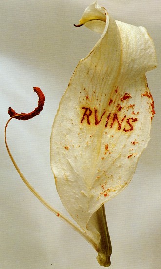 Ainsi, c’est au travers de l’objectif de leur appareil photo qu’Anne et Patrick Poirier figent à jamais toute la fragilité de la nature. Un mot, cinq lettres, inscrit délicatement au pollen sur un pétale de fleur… Ruins, issue de la série Fragility, souligne toute la sensibilité de notre écosystème.
