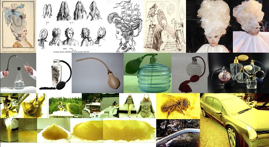 Différemment, Marie Denis évoquera cette fragilité en emprisonnant dans un flacon de verre du pollen que l’on ne pourra vaporiser qu’avec parcimonie, pressant une poire qui fera ainsi irrémédiablement écho aux flacons de parfum Guerlain, tout aussi précieux… Cette oeuvre, intitulée Spray Spirit, sera spécialement réalisée pour l’exposition par l’artiste.