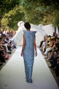 La femme On Aura Tout Vu est une Venus aquatique, véritable sirène ondulant dans sa robe longues en écailles bleues, fabuleuse prouesse technique tant la broderie est subtile et parfaite. Avançant à petits pas sur le bitume, elle rêverait de pouvoir marcher librement pour retrouver son Prince Charmant. L’écaille est toujours présente dans une robe courte grise accompagnée d’un sac poisson d’un réalisme étonnant. Le détail de l’écaille est même reproduit sur la paire de lunettes de soleil.