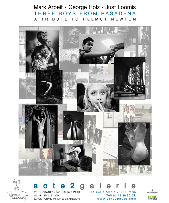 La Galerie Acte2 présente jusqu’au 28 août l’exposition intitulée “Three Boys From Pasadena: A Tribute to Helmut Newton“, organisée par June Newton (Alice Springs), la propre femme du photographe. L’exposition regroupe les travaux de trois photographes qui ont accompagné la carrière de Helmut depuis 1979 : Mark Arbeit, George Holz et Just Loomis, travaux sont visibles à la Fondation Helmut Newton à Berlin.