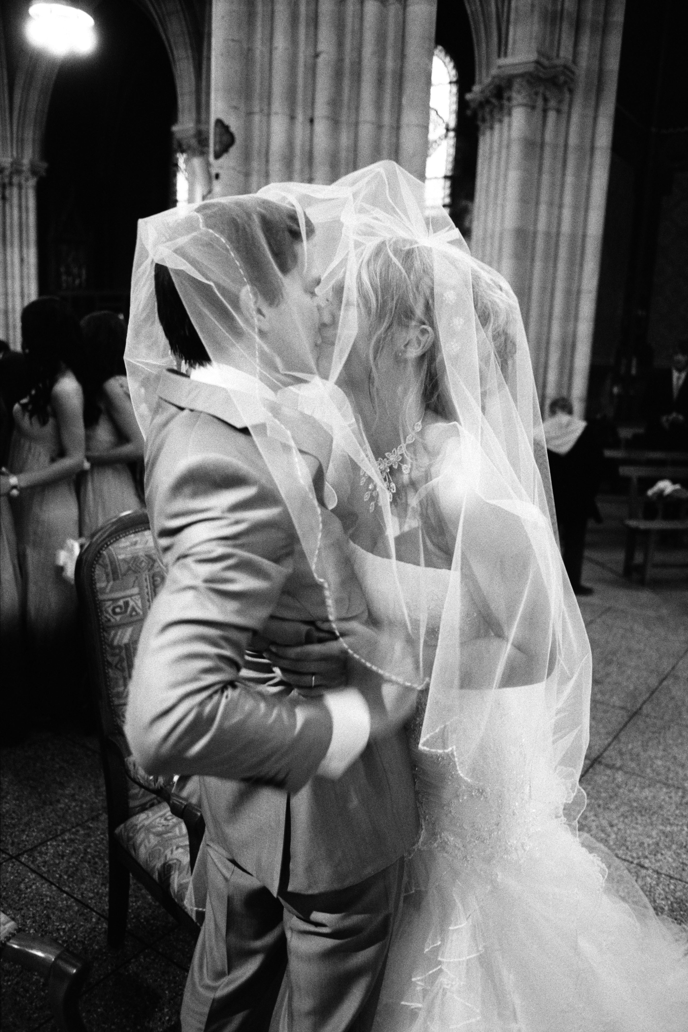 Soudain, sur un mur, des phrases défilent. Le photographe a également rapporté les conversations qu’il a eu l’occasion d’entendre pendant ses prises de photo. Amusantes ou émouvantes, ses phrases dévoilent l’état psychologique dans lequel se trouvent de jeunes mariés. A la fin du voyage au pays des robes blanches et des festivités se trouve un film de 26 minutes. Réalisé par Pierre Schumacher à partir de photos et de scènes recueillies lors des cérémonies, et nourri du matériel sonore issu des entretiens avec les mariés, avant, pendant et après les mariages, ce film témoigne de la démarche du photographe pendant les 2 années de reportage.