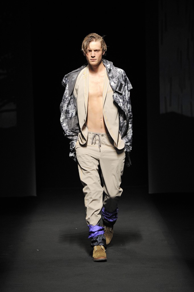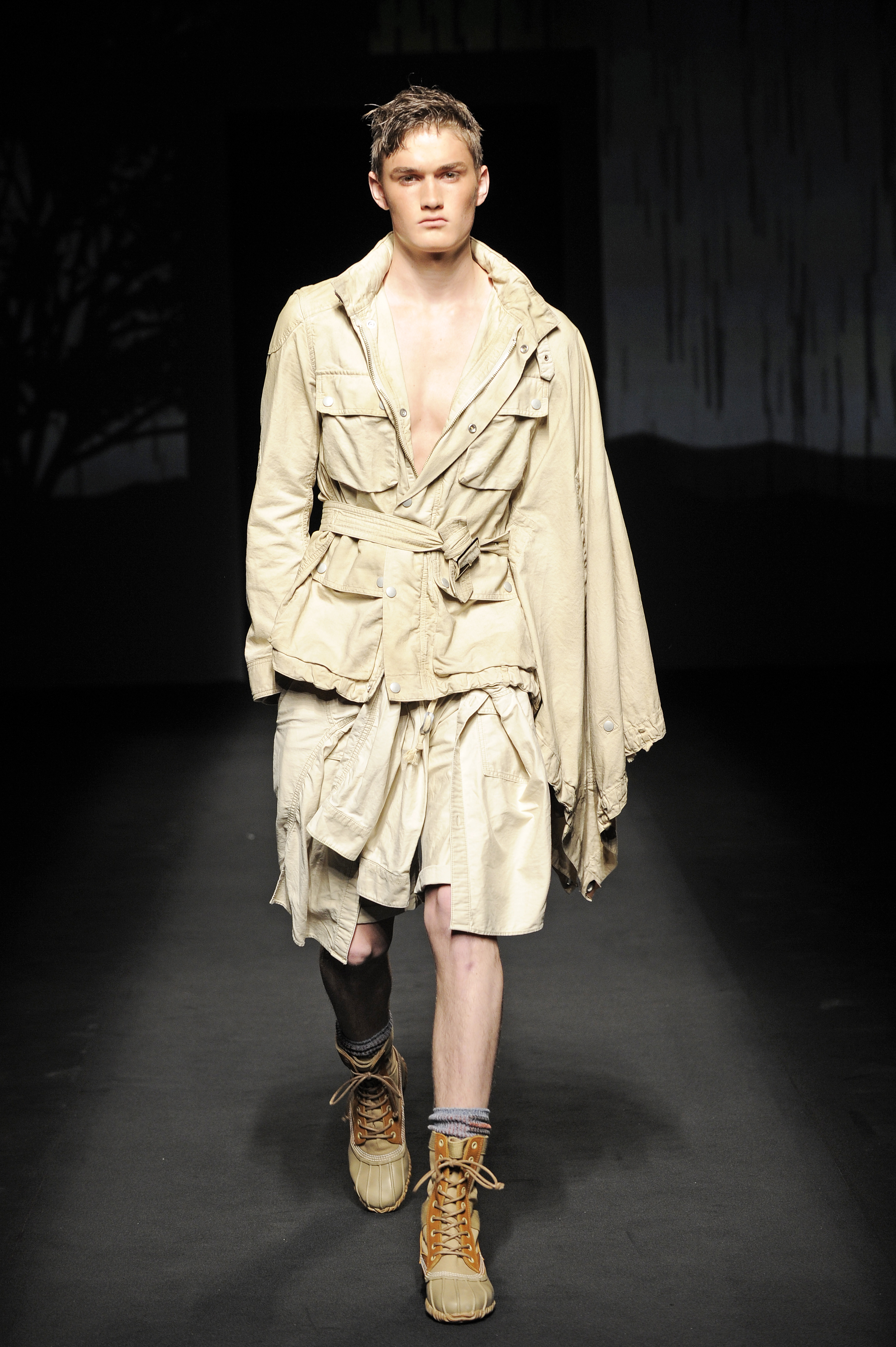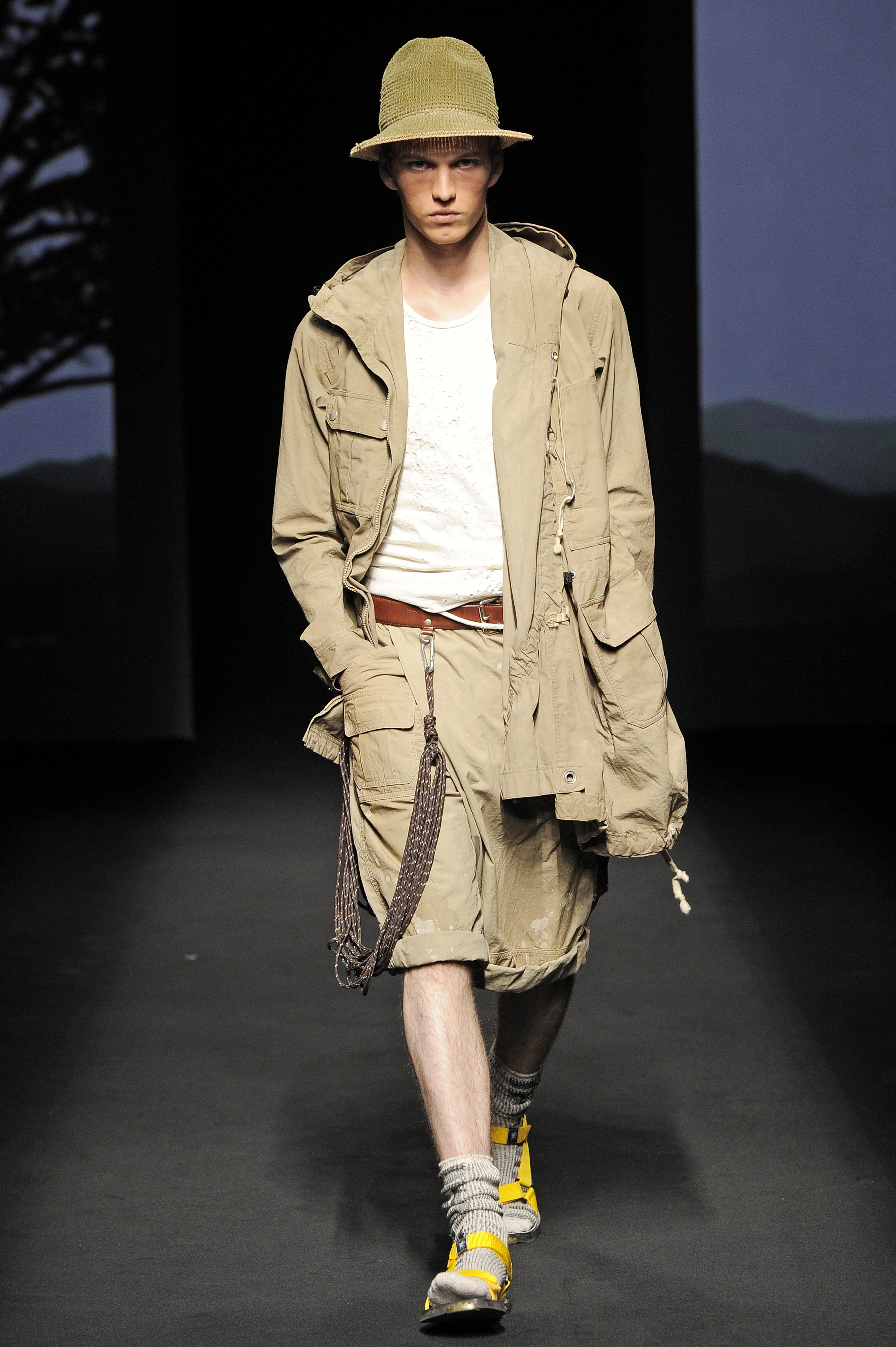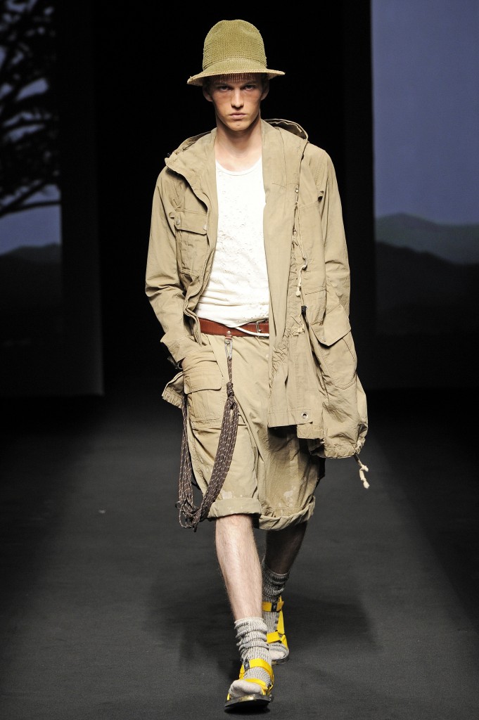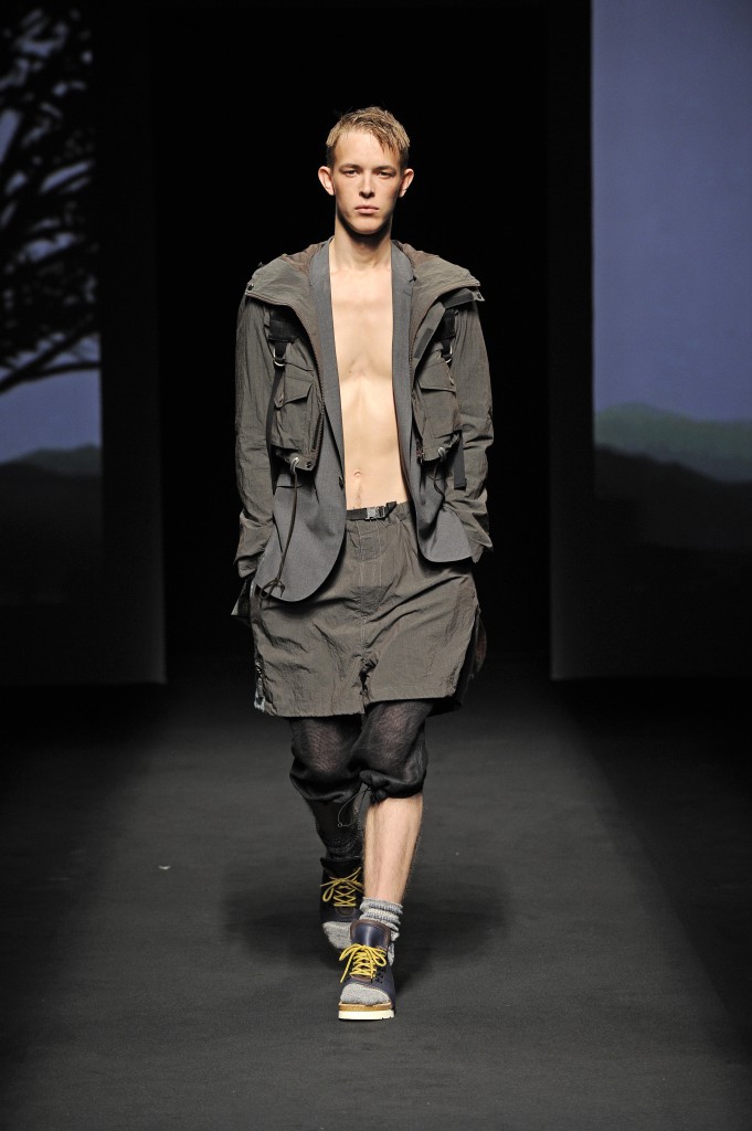 La nature s’éveille doucement, une silhouette d’homme apparaît en ombres chinoises se transformant rapidement en milliers de silhouettes d’oiseaux prenant son envol. Le mâle urbain peut commencer son périple. Les tenues dans des tonalités beiges, marrons ou kakis se succèdent parfaitement adaptées pour une randonnées en forêt ou dans les hauteurs montagneuses et mettant en avant le bermuda. Les grosses chaussettes sont de rigueur qu’elles soient portées avec des mocassins, des sandales ou des chaussures de marche. L’accessoire idéal est le sac à dos. Mihara Yasuhiro réinvente le gilet de chasse et la saharienne. On retrouve quelques clins d’œil du créateur comme son fameux tartan, son goût pour l’asymétrie et sa tendance à multiplier les couches de vêtements.