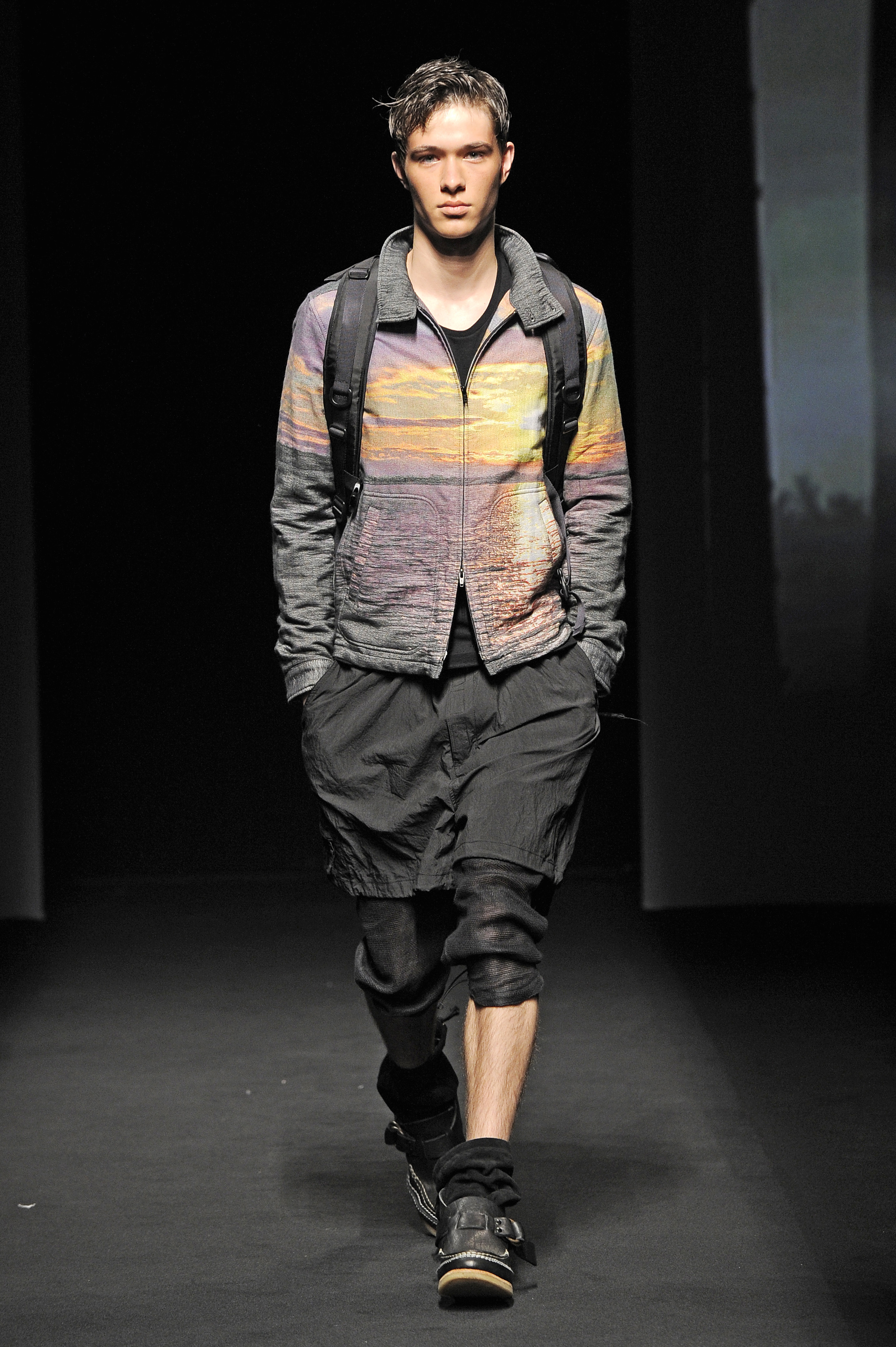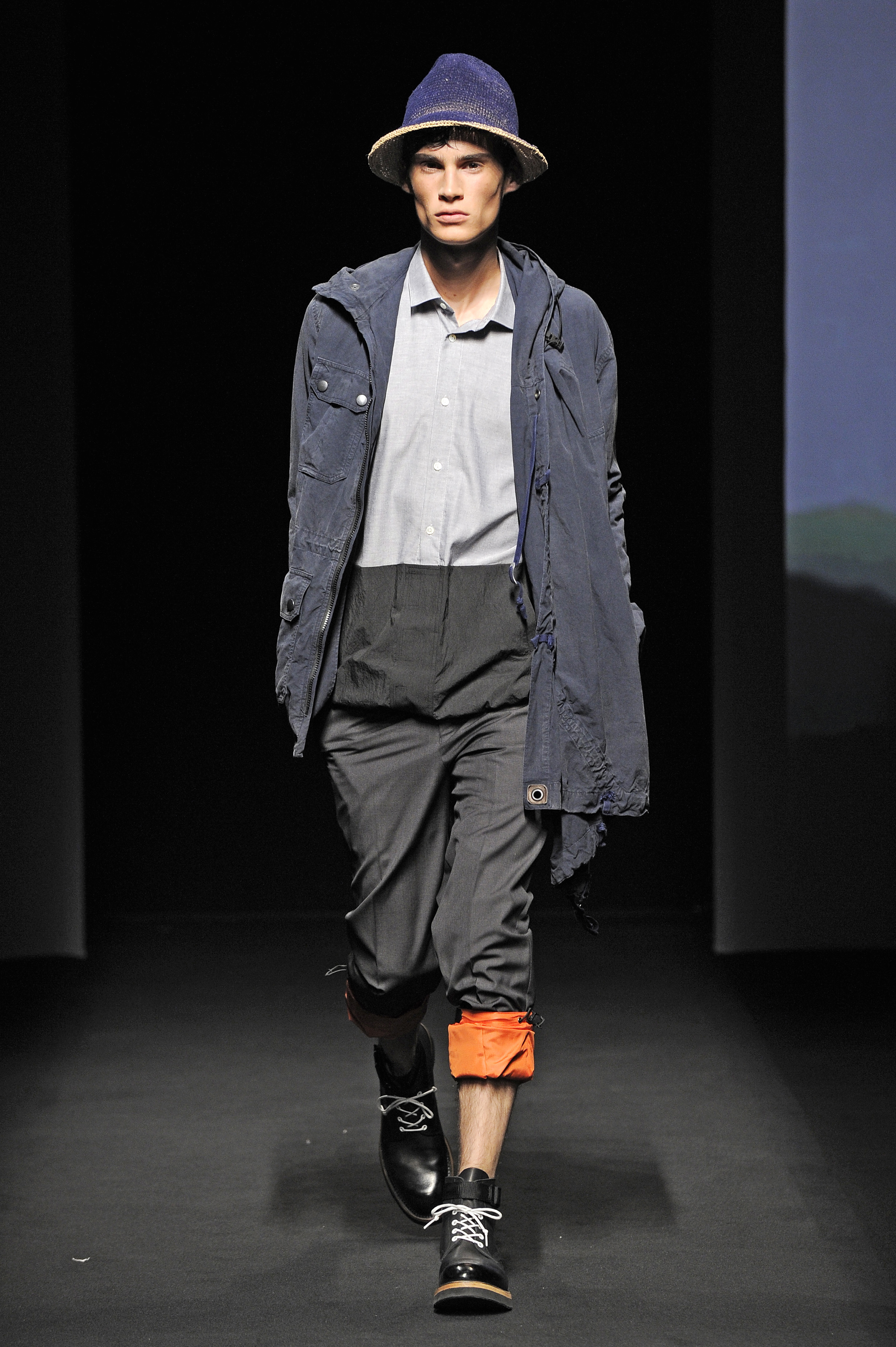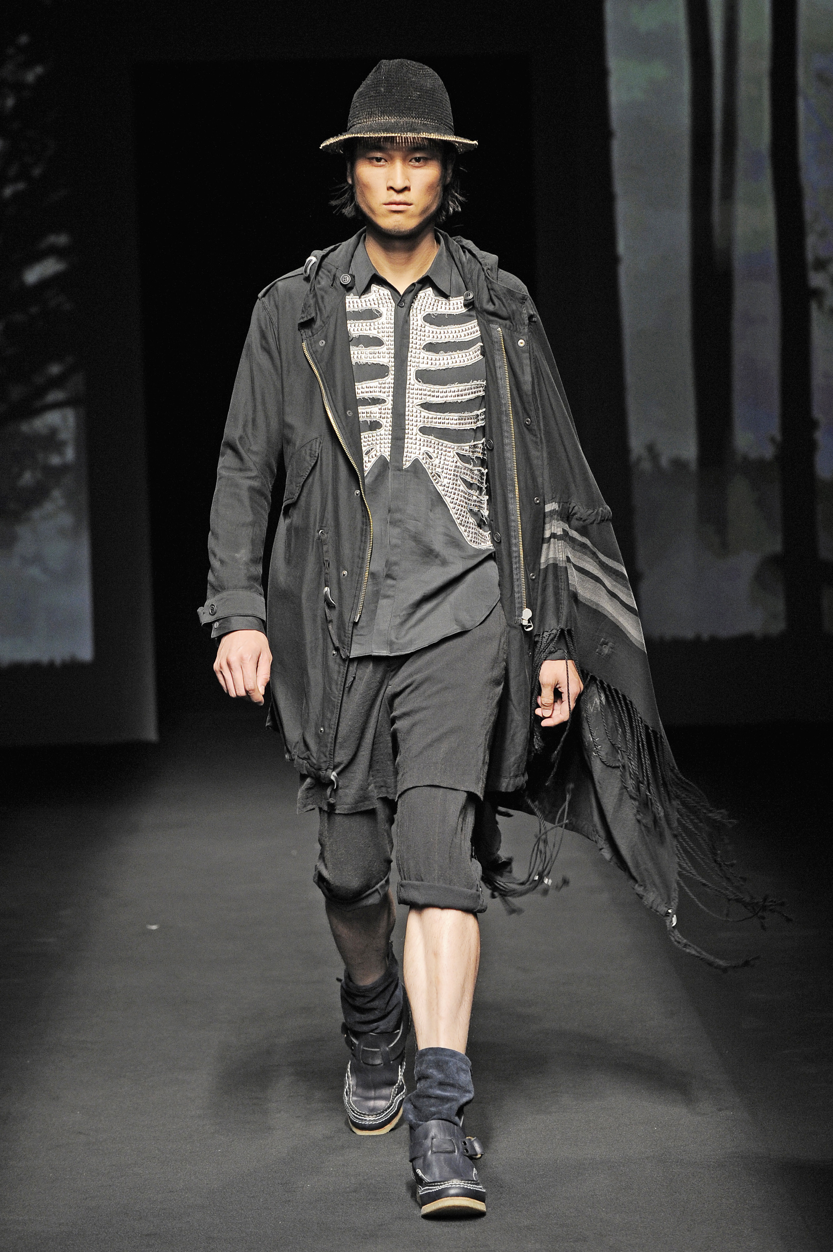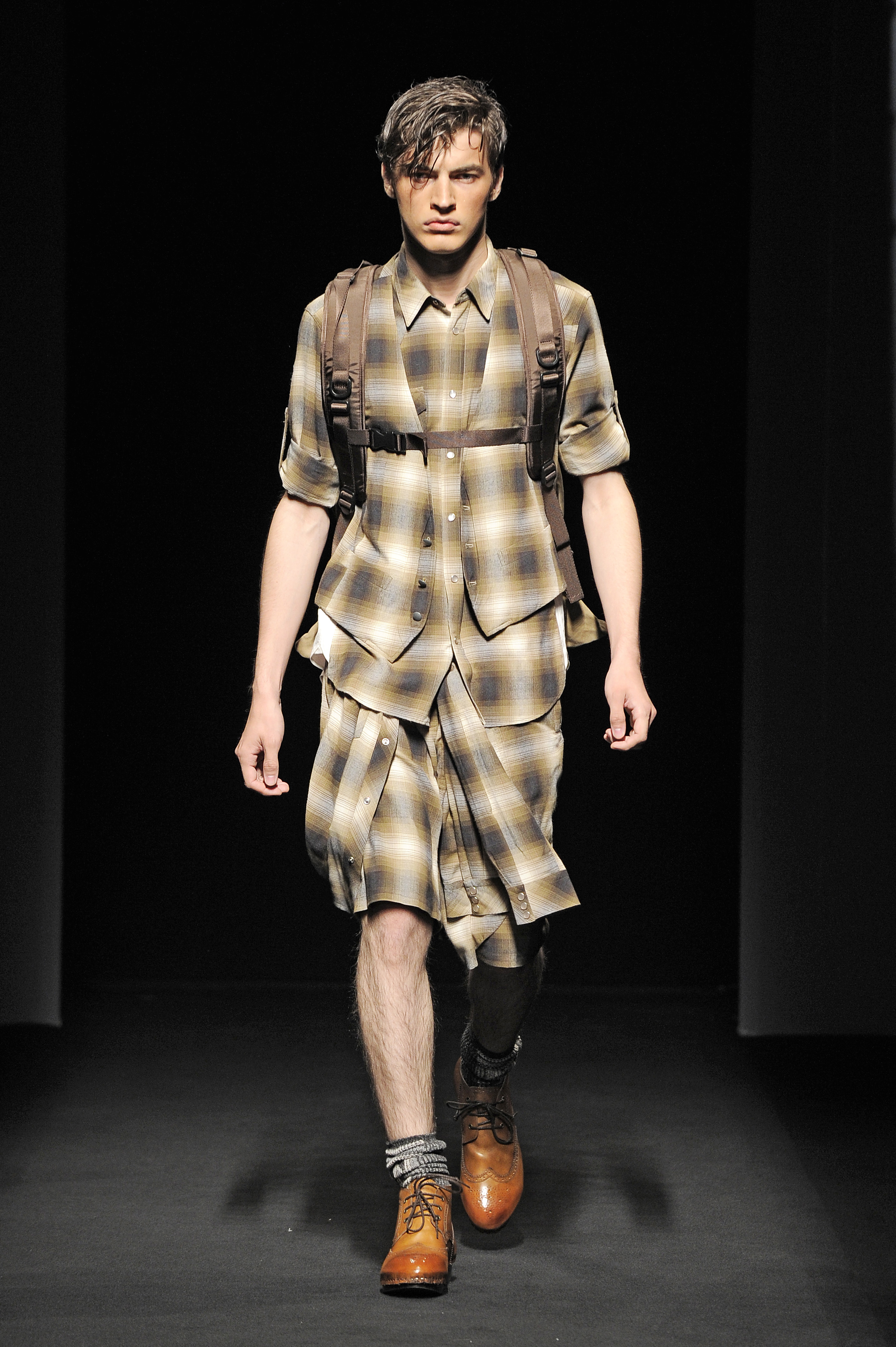 La nature s’éveille doucement, une silhouette d’homme apparaît en ombres chinoises se transformant rapidement en milliers de silhouettes d’oiseaux prenant son envol. Le mâle urbain peut commencer son périple. Les tenues dans des tonalités beiges, marrons ou kakis se succèdent parfaitement adaptées pour une randonnées en forêt ou dans les hauteurs montagneuses et mettant en avant le bermuda. Les grosses chaussettes sont de rigueur qu’elles soient portées avec des mocassins, des sandales ou des chaussures de marche. L’accessoire idéal est le sac à dos. Mihara Yasuhiro réinvente le gilet de chasse et la saharienne. On retrouve quelques clins d’œil du créateur comme son fameux tartan, son goût pour l’asymétrie et sa tendance à multiplier les couches de vêtements.